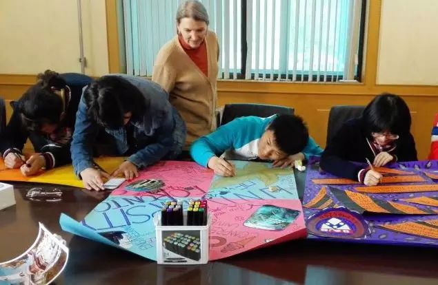 英语外教Debra结合国际部欧美班的特点,指导学生们设计了国外名校海报,包括不同学校的录取分数要求 ,学校校训校徽,学校特点等介绍,学生们在有说有笑的创作的过程中也锻炼了搜寻信息、团队合作、想象力等能力。