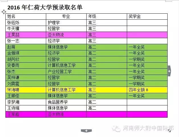 参加面试的16名全部同学被录取。并且9名同学都获得了奖学金。最高有宋海啸同学获得了四年全奖B(免四年奖学金并且每月补助30万韩币)。相当于高考高出一本线五十分。还有王昊喆和王军超同学被亚洲数一数二的学霸专业亚太物流给录取。师大附中国际部再次在河南省录取情况获得了榜首的佳绩。再次祝贺这批同学顺利通过。并期待三月底成均馆大学预录取再创辉煌!