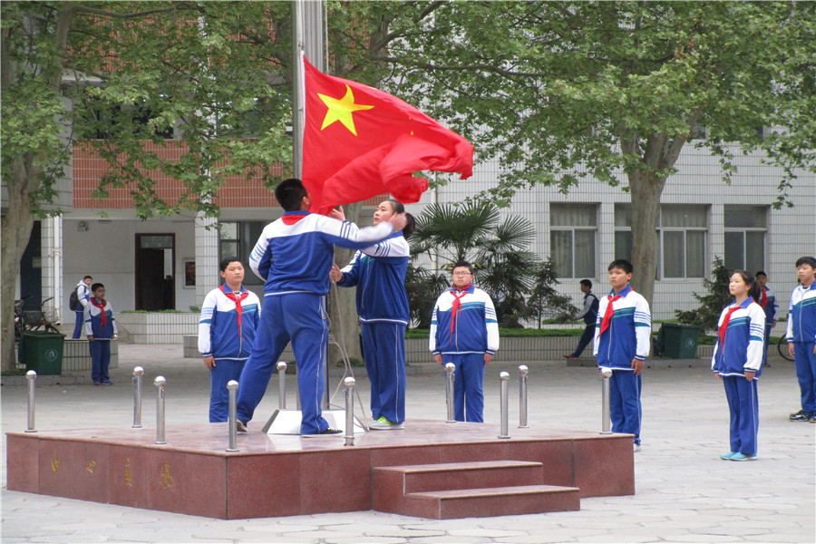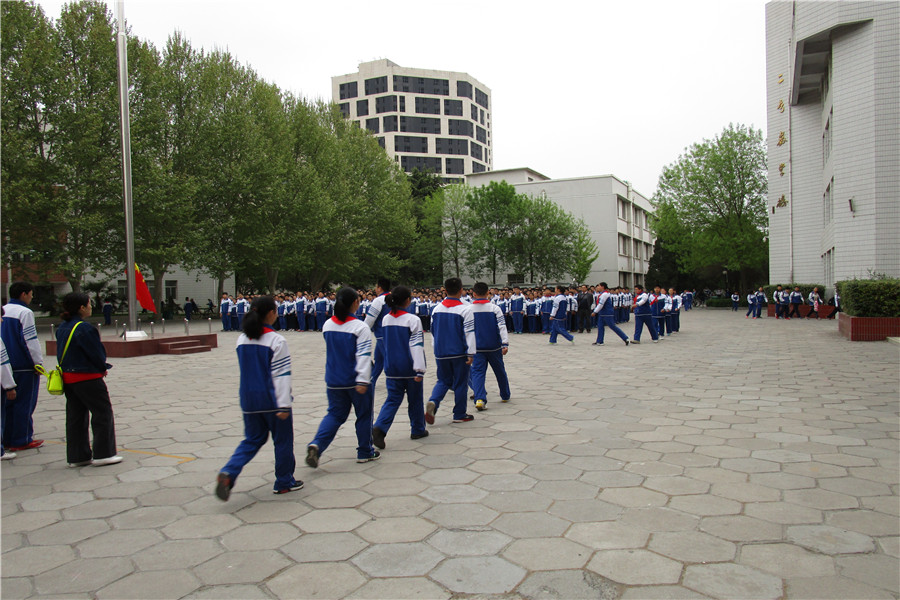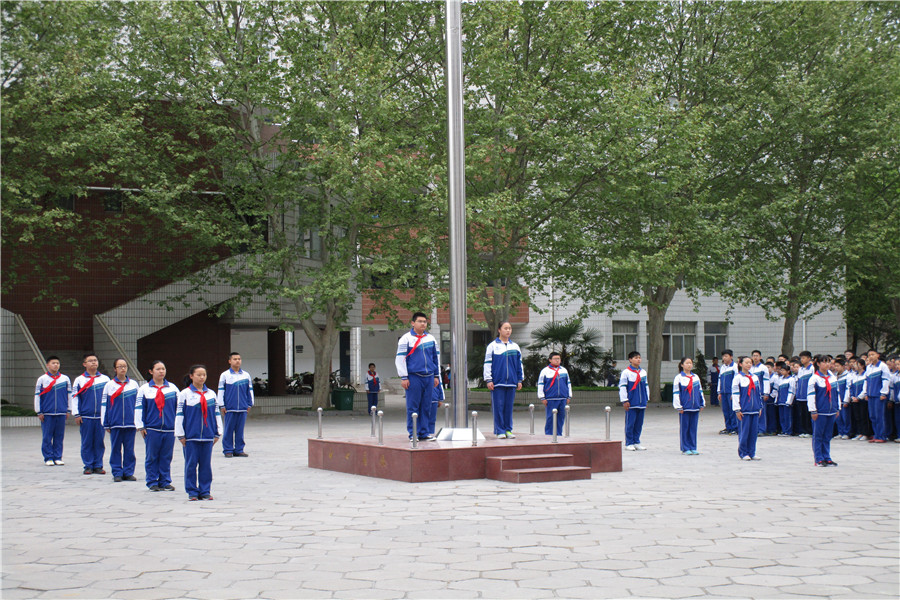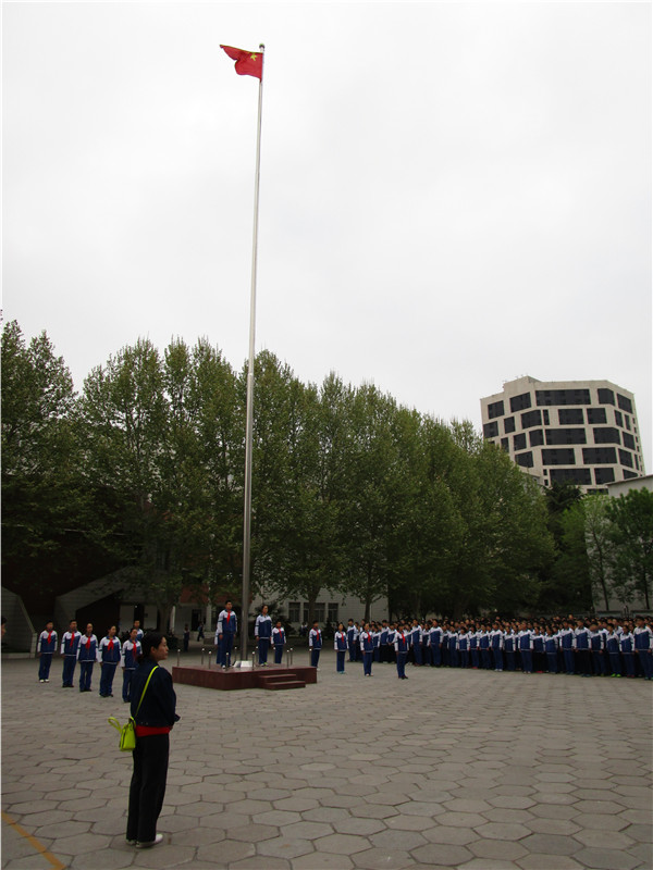 早上七点,升旗仪式正式开始。河南师大附中初2014级国旗班——初1419班的仪仗队队员,团员佩戴着团徽,少先队员佩戴着鲜艳的红领巾,喊着铿锵有力的口号,迈着整齐矫健的步伐走向国旗台。