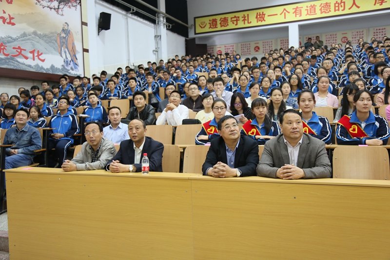 我校第二十八期道德讲堂活动于5月9日下午在逸夫科技馆道德讲堂开讲。本期道德讲堂由金龙高一年级部承办,主题为“超越自我,开拓创新”。我校党委书记包卫忠、副校长赵振华、团委书记杨呈杰、金龙高中教育教学部主任刘新选、副主任郭卫强等学校领导与金龙高一年级六百余名师生共同参与了此次活动。