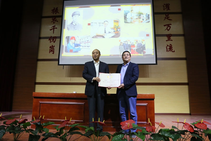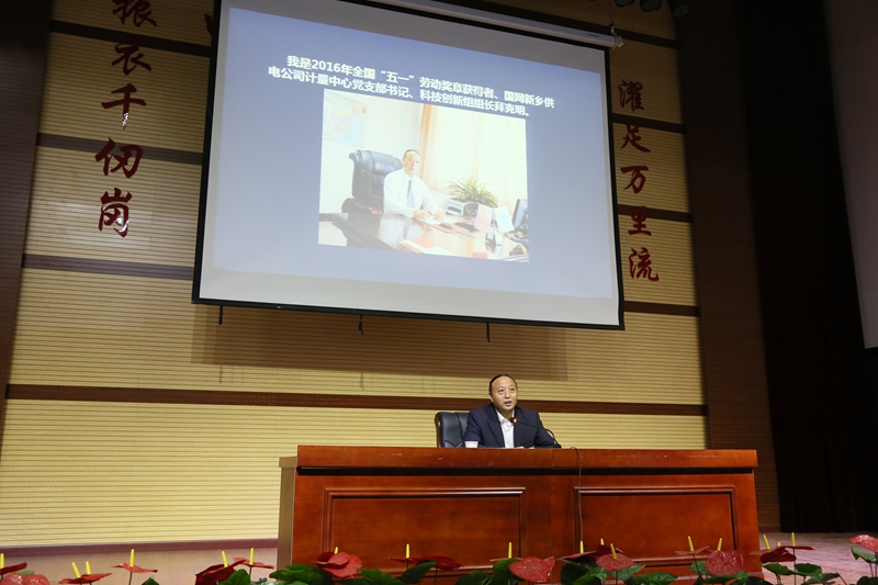 《公民道德歌》中写到“敬业奉献、勇创新,建设祖国为人民”,本期道德讲堂学习的模范是我们身边建设祖国为人民的典范,全国五一劳动奖章获得者,国家电网新乡计量公司计量中心党支部书记拜克明同志。拜书记给在座的广大师生作了一场生动有趣、充满感染力的专题报告,向大家分享了自己怀揣梦想鹰击长空,实干兴业挑战自我,奉献爱心回报社会,从一名空军飞行员到省级电力专家的嬗变历程。他以自己的成长历程告诉同学们人生就是奋斗的过程,生命的意义就是不断地打拼,敢拼才会赢。拜书记锐意进取、开拓创新、爱心善举、情注和谐的高贵品质,深深感染了大家,赢得了同学们的阵阵掌声。