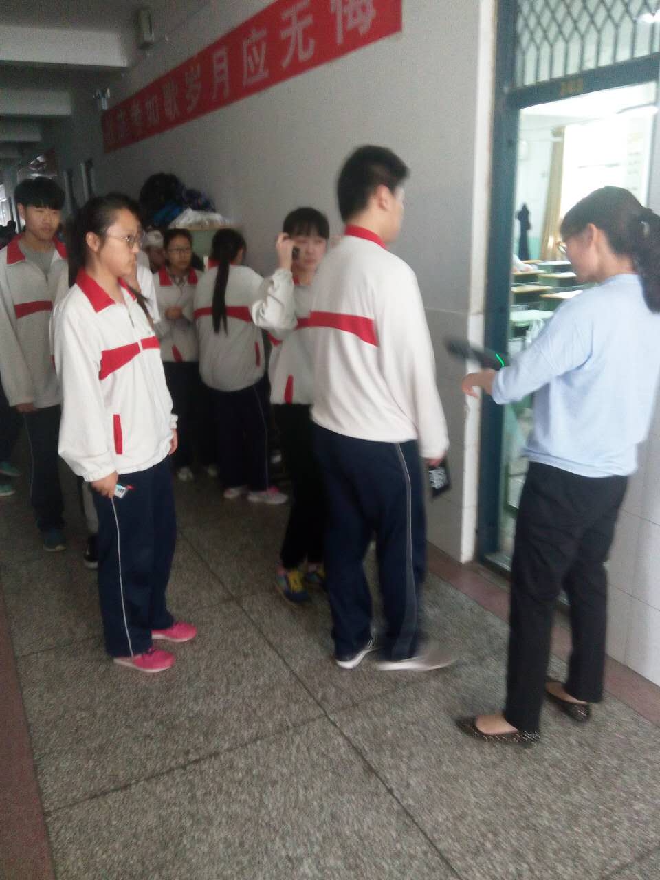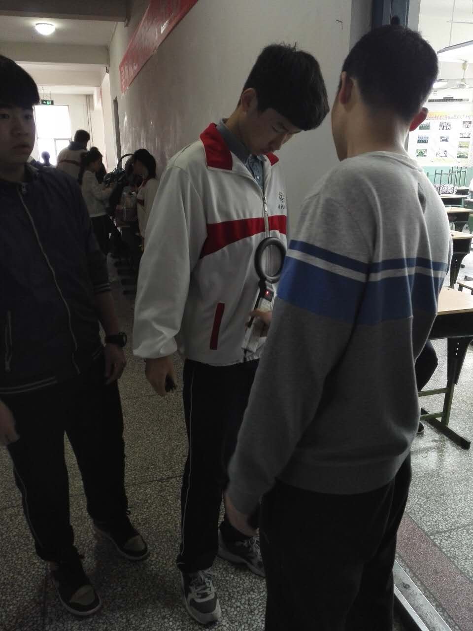 为确保考试效果,高三年级准备了金属探测仪。吴甜甜、杨建伟两位老师精心录制了语音指导语。年级组织人员联合网络中心工作人员对各考场的多媒体进行了检查,确保录音播放正常。本次考试每个考场配备两名监考老师,全年级老师齐上阵、严监考,确保了本次模拟考试的顺利进行。