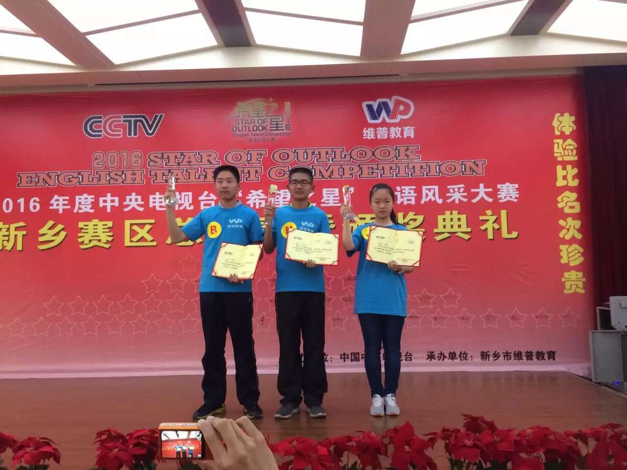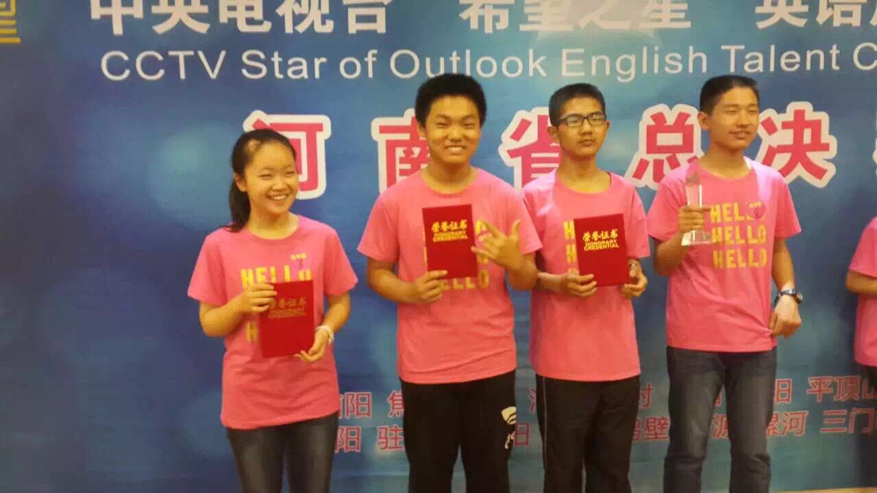 5月28日、29日,河南省总决赛在郑州开赛。参赛选手经过自我风采展示、现场抽题演讲、组队故事接龙、听词义猜单词、即兴问答等环节的激烈角逐,与省内高手切磋竞技,最终来自初1406班许志昊、杨君行,初1404班王桐新、初1405班宋佳蔚4名同学获得省一等奖,许志昊同学同时夺取河南省赛季军奖杯;初1405班高崧瑜、尹媛媛、李明雨、倪梓元、荆丹宁、初1406班张雨竹6名同学获得河南省二等奖;初1406班樊子恒、李安东、孟宫子芊,初1502班穆若彤、初1503班张奕凡5名同学获得省赛三等奖。