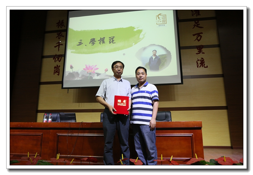 我校聘请李峰教授为“特聘道德讲堂讲师”,王继民副校长颁发聘书并合影留念。