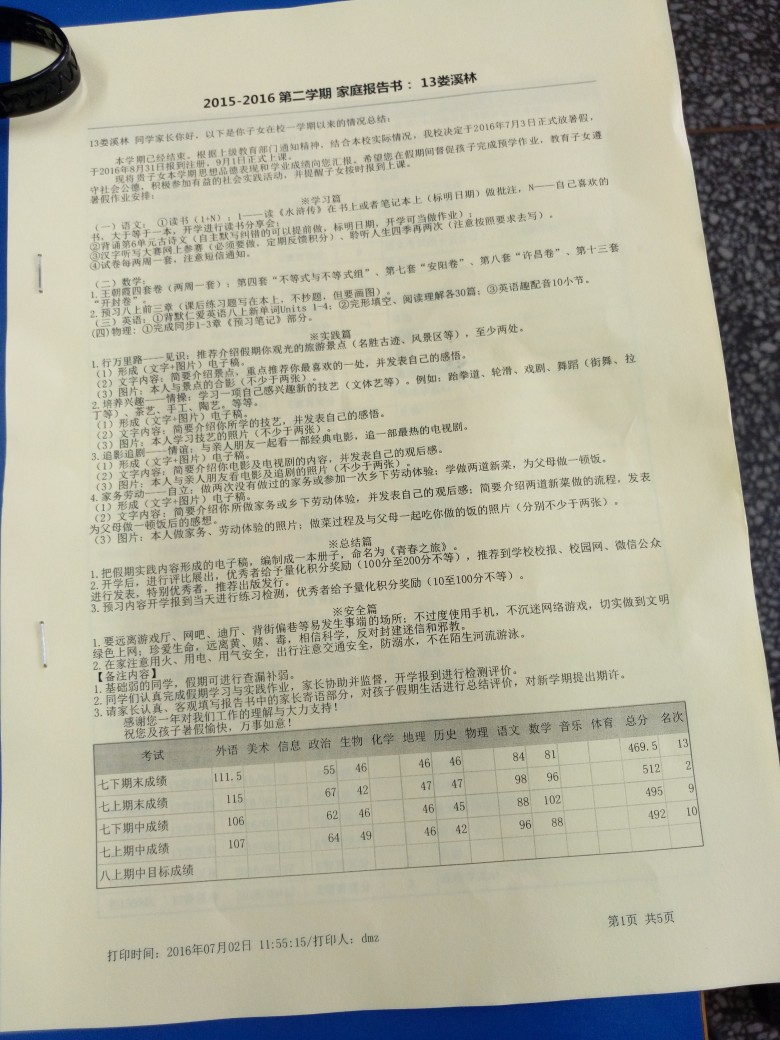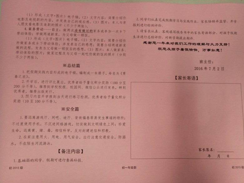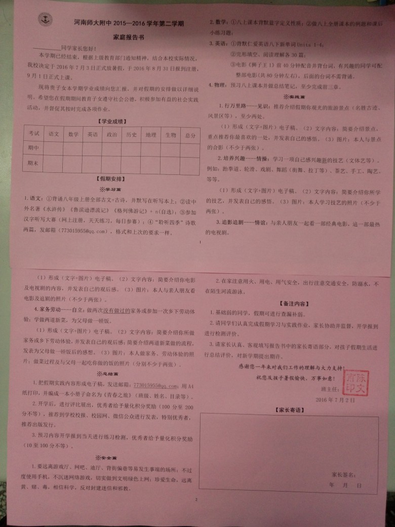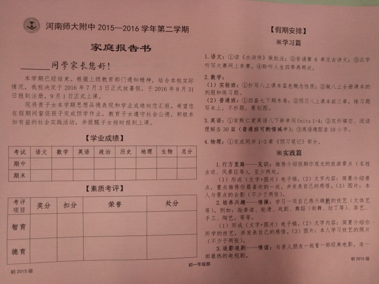 7月3日下午五点,在各班期末表彰大会结束后,年级要求各班统一召开了期末考试家长会。本次家长会在分析期末考试成绩、介绍初二年级特点等常规内容的基础上,又增加了一项新的内容——发放《家庭报告书》。《家庭报告书》由学业成绩、素质考评、假期安排和备注内容四大板块组成,是对学生一学期以来在校综合表现的汇总。通过《家庭报告书》,家长们可以更加清楚地了解孩子在校的学业成绩、思想品德以及假期的作业安排等详细内容,同时也为家长在假期中更好地督促学生学习提供了有力保障。
