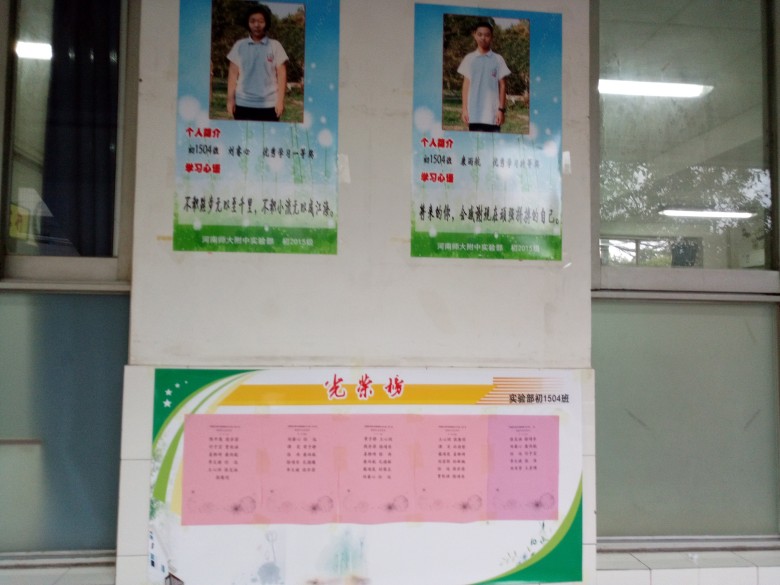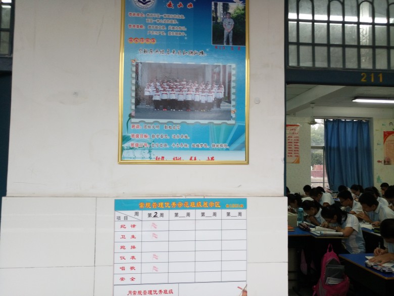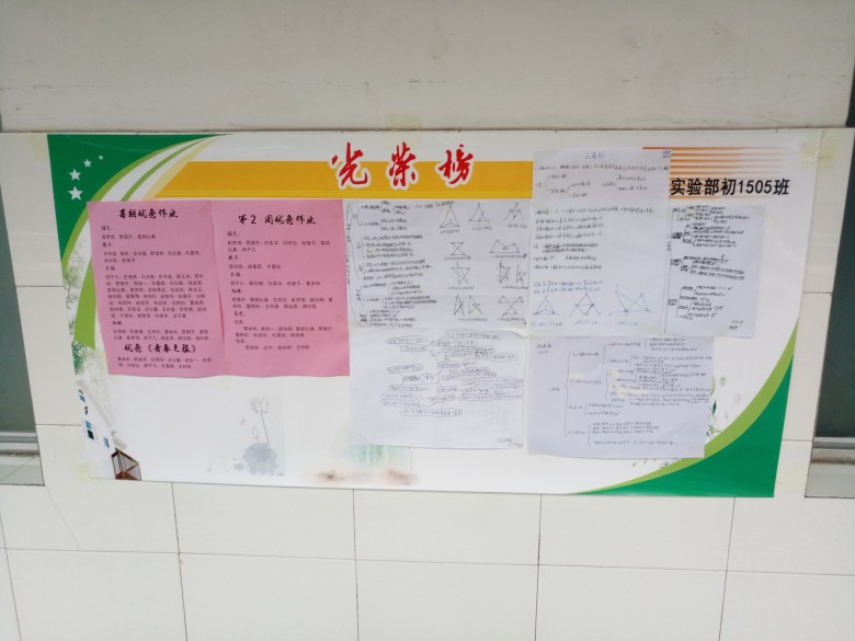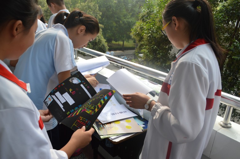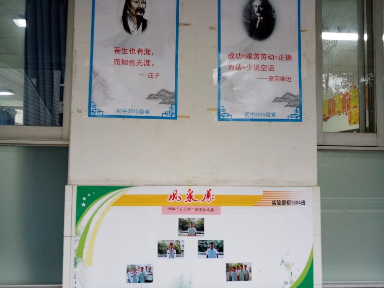 同时,在年级的统一安排下,年级的整体文化和班级的个性文化也进行了更新:年级的外墙更换了学生学习心得和名人名言,增加了光荣榜、风采展和常规管理优秀示范班级展示区;各班张贴了班级名片、班训牌、学科学习方法和荣誉墙等内容,并进行了个性化的设计。