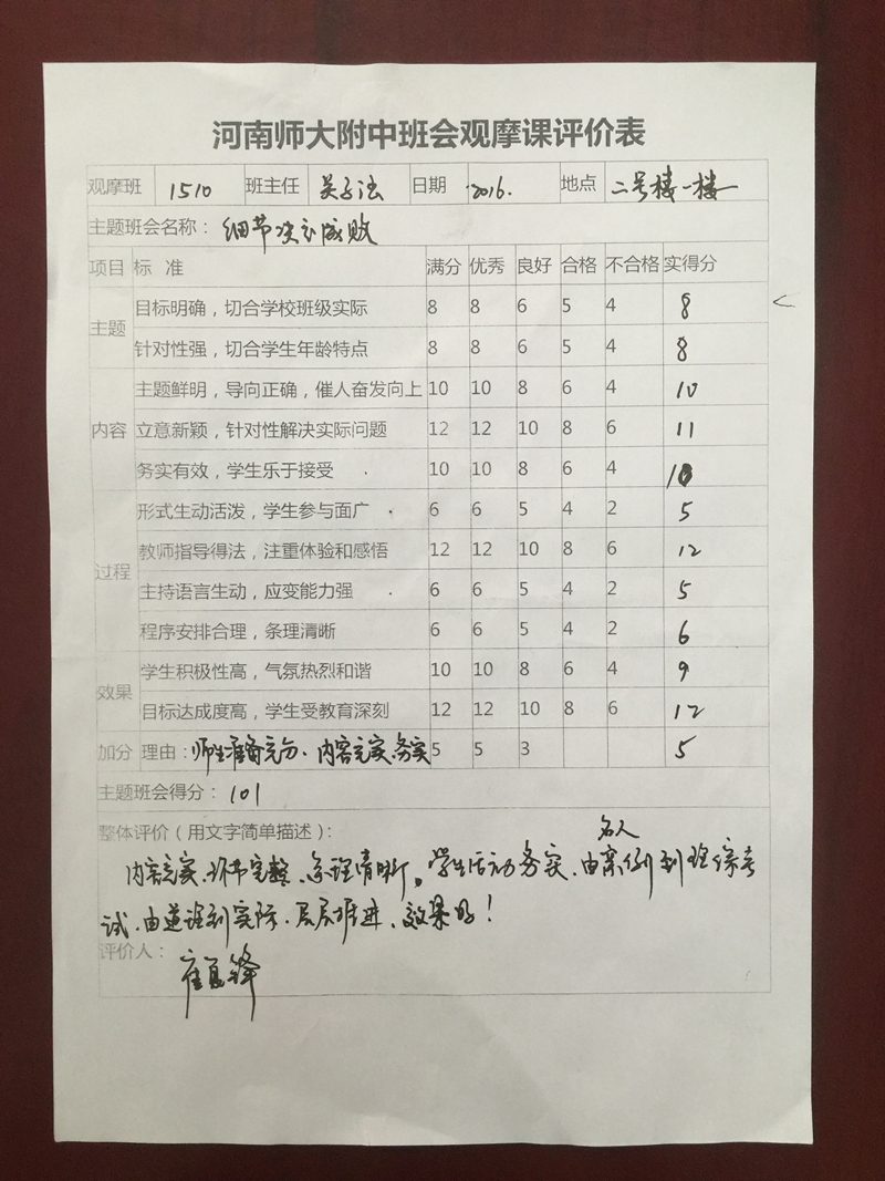 2016年9月23日下午第三节,高二1510班代表高中部高二年级举办了“关注细节,强化习惯,成就学业”为主题的观摩班会课。高中教育教学部主任侯伟、高中教育教学部副主任刘毅、高一年级部主任崔夏峰、高二年级部主任臧绍民及各班班主任参加了此次观摩活动。