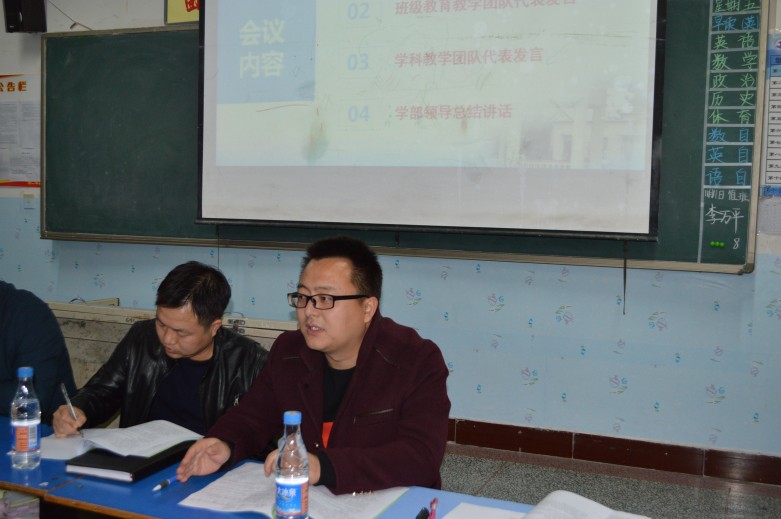 1501班班主任陈源老师作为班级教学团队代表发言。陈源老师从加强班委培养,落实量化积分,营造学习氛围,平衡各科成绩,注重抓尖培优等方面为老师们提供了可具操作性的建议。数学备课组长付帅老师作为学科教学团队代表发言。付帅老师首先指出了初二是整个初中数学学习的关键时期,并强调了在教学中要明确目标意识,强化质量意识,统一进度意识,加强沟通意识。