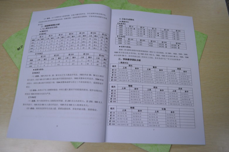 实验部初二年级主任刘敏灵从年级整体成绩、班级教学团队和学科教学团队三个方面分别进行了横向和纵向的数据对比分析,指出了存在的问题:学生目标有待明确,班级管理有待细化,德育工作有待深入,教学团队有待沟通;并制定了对策和措施:开展目标分层培养机制,进一步落实常规量化积分奖惩兑换机制,深入落实学生作业周优秀展评机制。