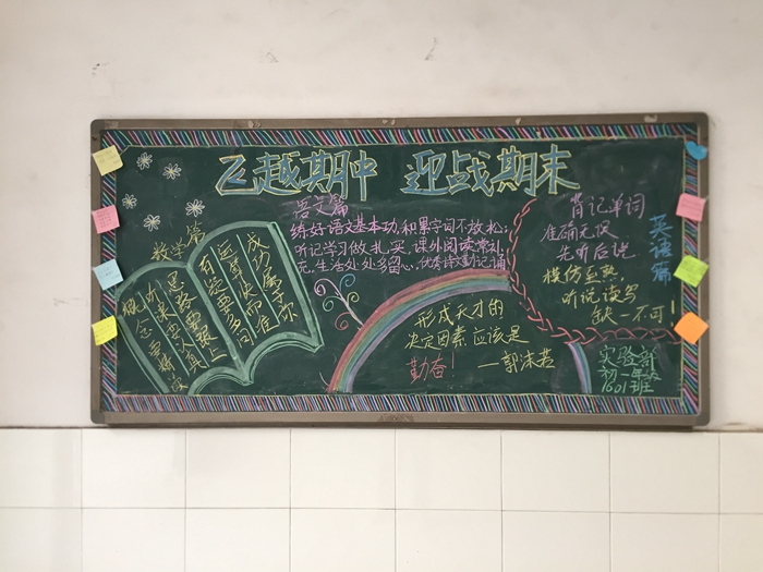 为了营造学生期中考试后学习先进、鼓足干劲、携手共进的优良环境,年级充分利用一切条件,以教室的布置为突破口,积极行动、打造各具特色的班级文化。