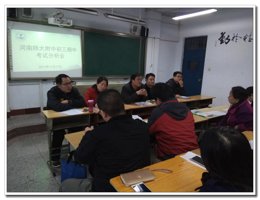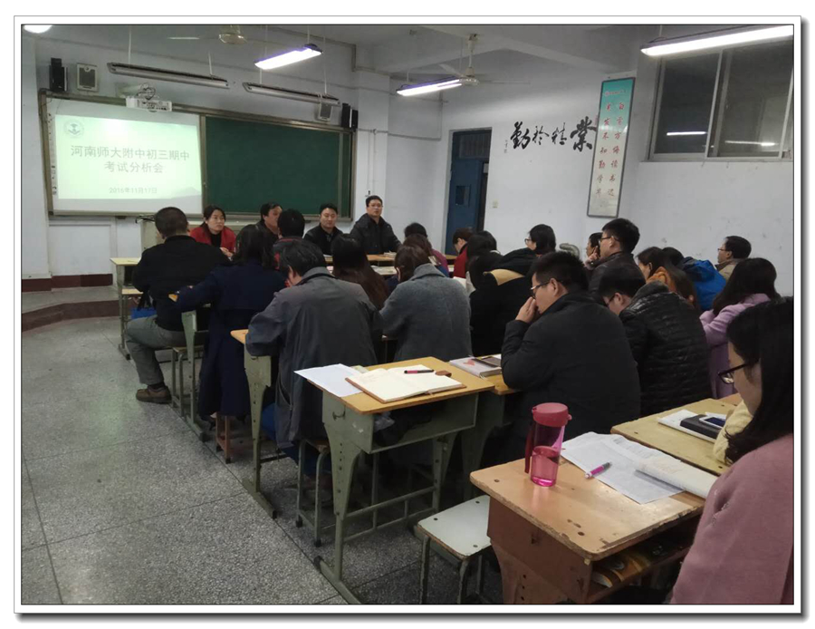 11月17日下午,金龙初三年级在东区教学楼四楼公共教室举行了以“总结·调整·提升”为主题的2016-2017学年第一学期期中考试成绩分析会。初中教育教学部主任陈景任、副主任都温中、张凤霞以及初三年级全体教师参加会议。会议由年级主任薛卫忠主持。