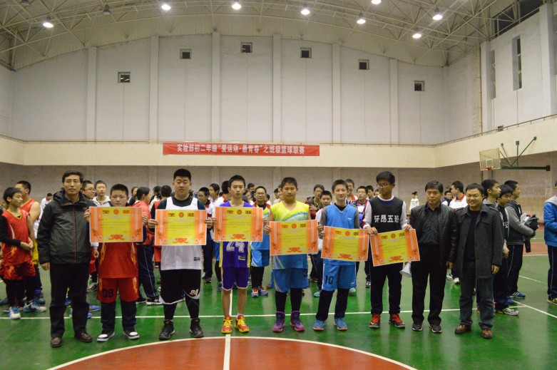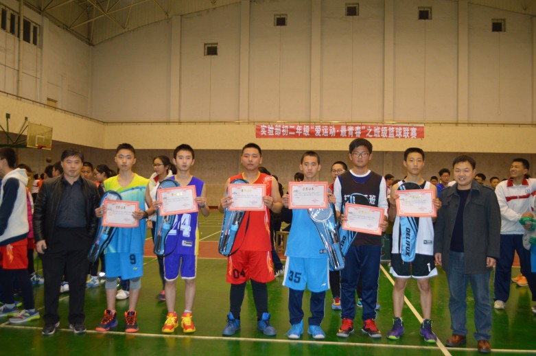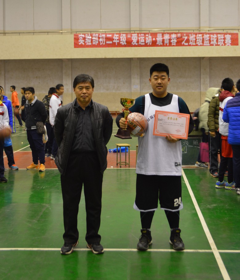 11月21日下午,“爱运动·最青春”班级篮球联赛圆满落幕,实验部主任汪才安,副主任赵东亚莅临比赛现场,并为获奖的班级和个人颁奖。比赛最终产生的团体冠军由1506班获得,亚军由1503班获得,1501班和1502班获得一等奖,1504班和1505班获得二等奖;比赛产生的个人奖项“得分王”分别由赵琛、宋豫彬、田雯胜、王彦博、肖田晨俊、白润华等6位同学获得,“MVP”(最有价值球员)由来自1506班的张牧岳同学获得。