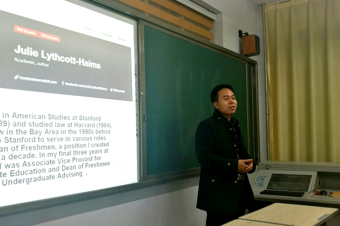 第一位分享教育教学心得的是来自韩国的李相润老师,李相润老师和金羊园老师是一对夫妻,在我校国际部教授韩语课已经一年多了,李老师、金老师高度的责任感和对学生无微不至的关爱深深的感染了每一名学生和老师,2016年教师节,李老师荣获“最受学生欢迎的老师”称号。