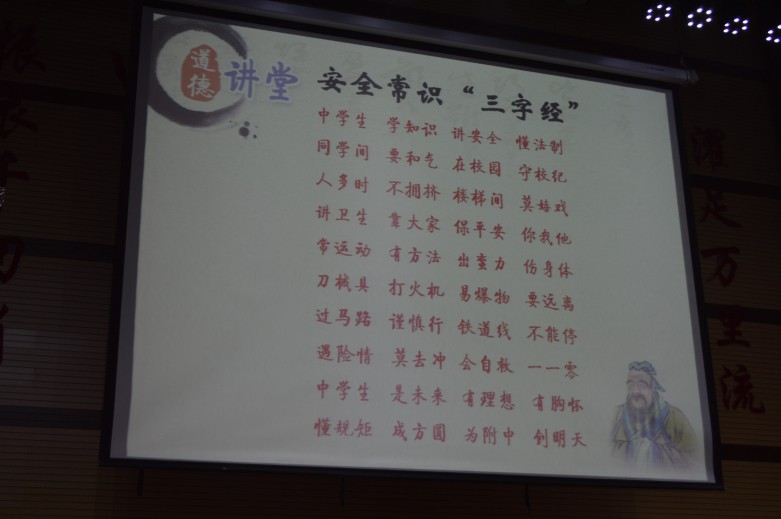 在“诵经典”环节中,全体师生齐声朗诵了《中学生安全常识三字经》。