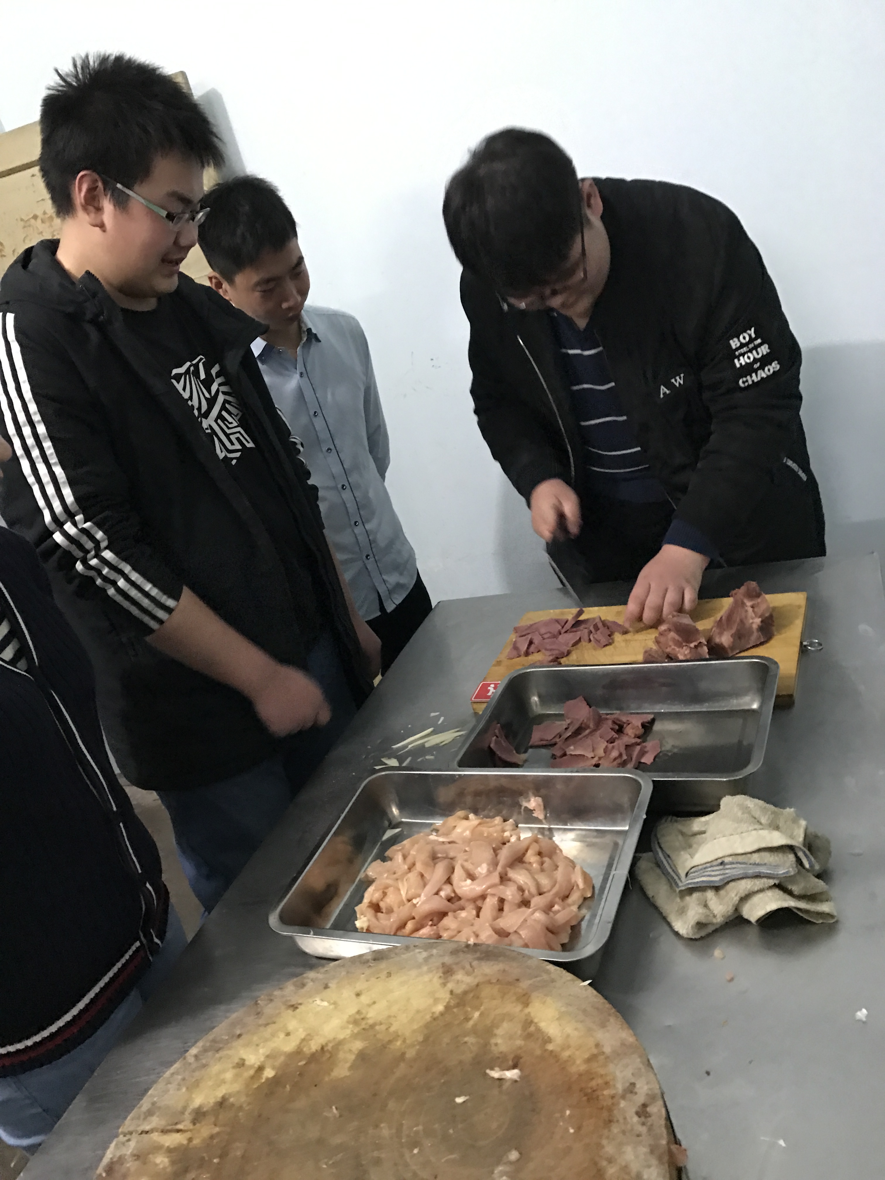 “从头到尾观摩了各位功力深厚的师傅们精湛手艺,那行如流水般的手法让我们叹为观止、自愧不如。看着我们同学们自己的刀工,我忍不住问自己这出国之后我们该如何生存。后来,我们每个人都细心观察,而且基本上每个人都小露一手。虽然我们做的菜的色泽香味和师傅们做的还差一点,但是已经非常不错了。为我们大家点赞。”------季翔宇