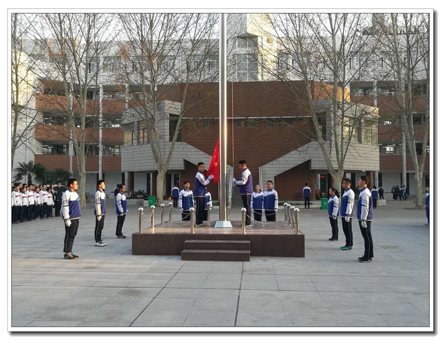 早上七点,升旗仪式在庄严的国歌声中开始,鲜艳的五星红旗冉冉升起,全体师生行注目礼。