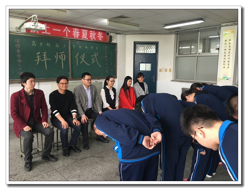 其后,拜师仪式正式开始,学生代表做拜师词。然后,同学们分科目向老师郑重的鞠躬,老师还礼。并一一鼓励。整个过程庄重而严肃,充满感动与激励。而后大家合影留念。