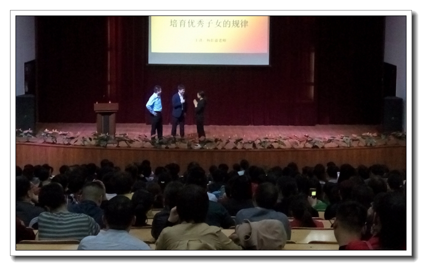 杨老师为了更好地让大家身临其境,就邀请两位家长登台体验。从“我想学好”、“学习太痛苦了”(这是一个人的两个方面),到“我想学好”、“学习太快快了”的转变,杨老师告诉家长,人的感受是会变的,教育孩子是需要方法和一定耐心的,我们要赏识孩子,让孩子成为赞扬的焦点,相信孩子有变化的可能性,当然最终的是付出真情,那便是简单而又无言的爱,那是你的孩子!
