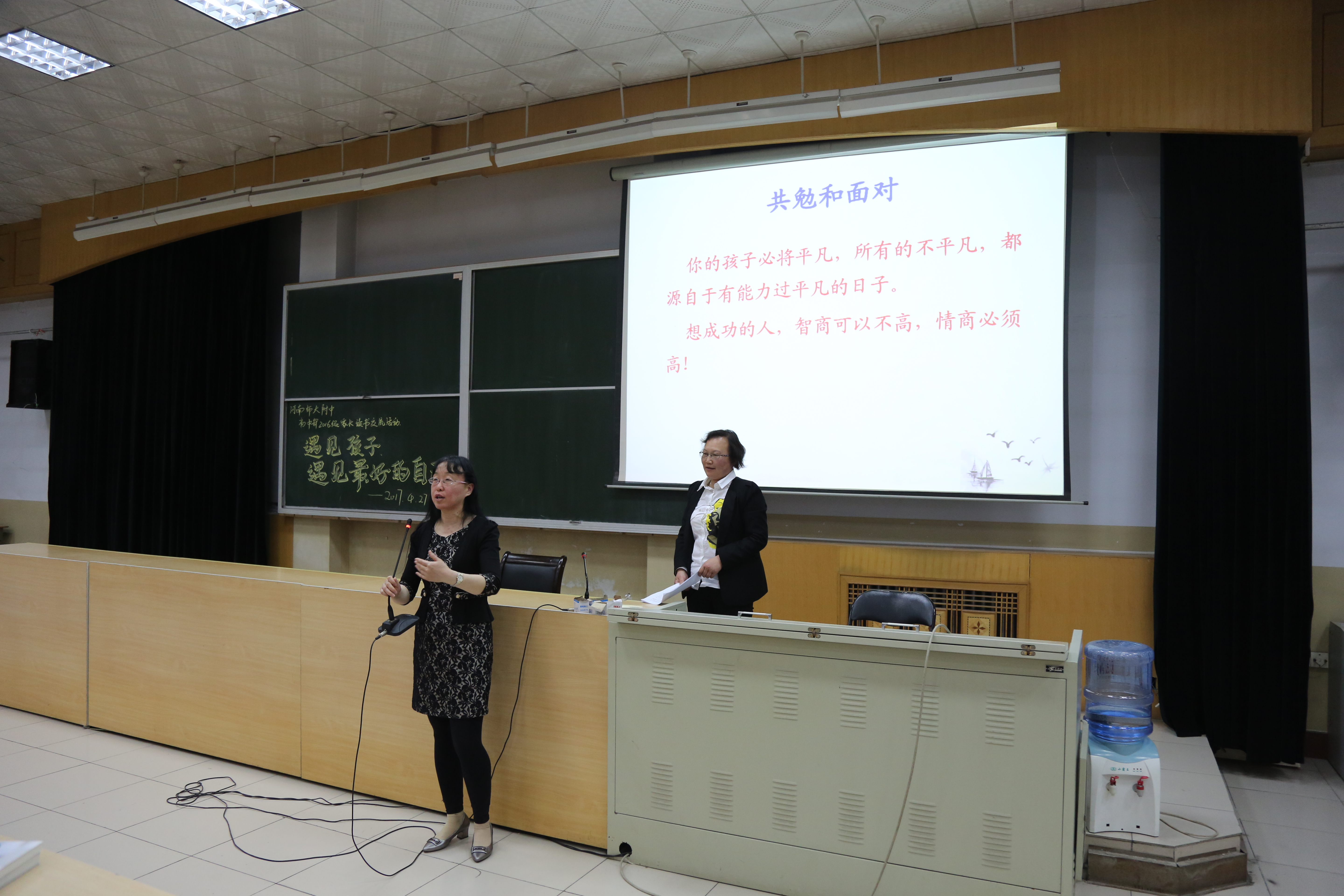 接着是1620班高子琦妈妈发言,她发言的主题是“陪伴路上共成长”。这位妈妈感叹,大多数父母一门心思地教导子女、授予他们技能、纠正他们的过错,一味的要求孩子出成绩,出成果,却忘记了亲子关系最重要的元素,没有了与孩子们共享的快乐时光,没有了与孩子们一起欢笑、一起成长。很多时候,孩子的坏习惯正是在家长的“批评”中养成的。让这位妈妈改变的正是这本《遇见孩子,遇见更好的自己》。她说,每位父母都要面对的是这样一句话:你的孩子必将平凡,所有的不平凡,都源自于有能力过平凡的日子。