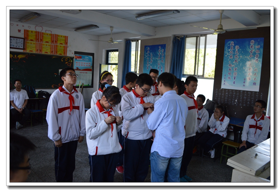 退队入团仪式开始,班主任、家长代表、任课教师代表为新团员摘下红领巾,佩戴团徽。