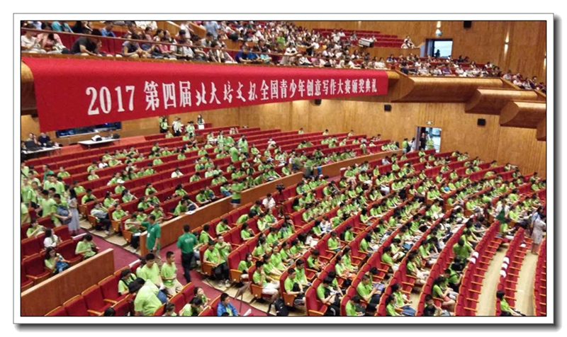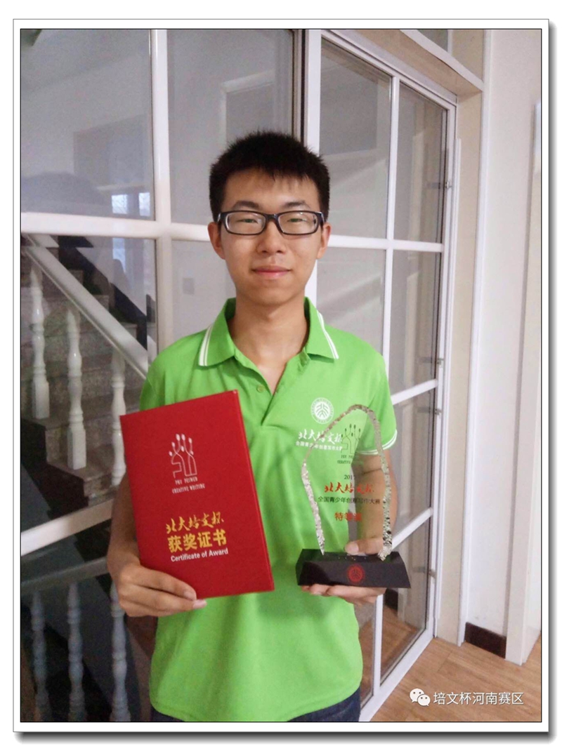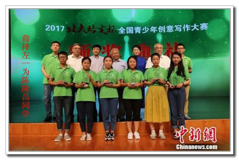 2017年8月2日,第四届“北大培文杯”全国青少年创意写作大赛颁奖典礼在北京大学百周年纪念讲堂隆重举行。我校高三9班陈隆昌同学荣获国家级特等奖!河南赛区唯有陈隆昌同学获此殊荣!本次竞赛共评出高中组特等奖10人,一等奖50人,二等奖218人,三等奖218人。