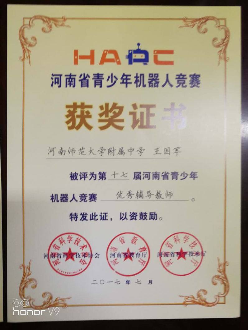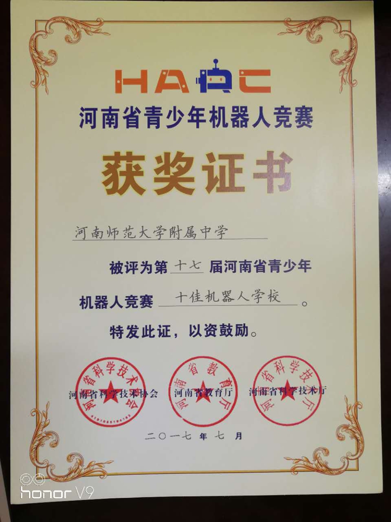因我校机器人团队在第十七届河南省青少年机器人竞赛中的突出表现,我校被河南省科技协会、河南省教育厅、河南省科学技术厅联合授予“十佳机器人学校”称号!我校王国军老师被评为优秀辅导教师!王家乐等十三名学生获得比赛一等奖,聂坦等十名学生获得二等奖!