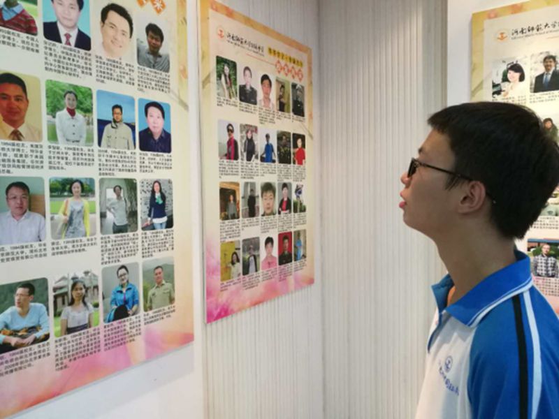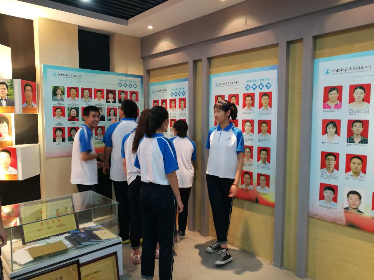 这是同学们首次参观学校校史馆, 校史馆内陈列的一块块展板、一件件实物、一张张照片,体现了师大附中六十多年的办学历史和厚重的文化底蕴。河南师范大学附属中学创建于1954年,是河南省教育厅直属的具有实验性和示范性的省重点中学、河南省窗口学校,在长达半个多世纪的办学实践中,师大附中为国家和社会培养了大量的栋梁之才。同学们认真参观,脸上流露出敬仰之情,并不时发出声声赞叹。