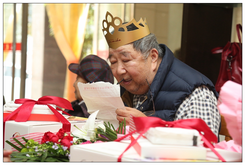 接着,大家一起为今年年满八十岁的老寿星杨素兰老师、程道模老师、杨乃钦老师和朱岱老师祝寿,刘黎校长、包卫忠书记和刘齐晋常务副校长分别为几位老寿星戴上生日帽,并送上鲜花和生日蛋糕,几位老寿星个个喜笑颜开,幸福地接受大家的祝福。