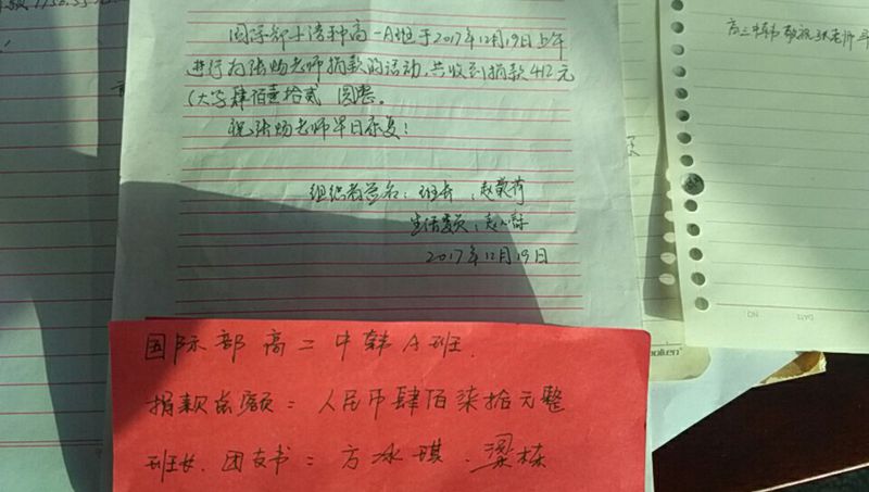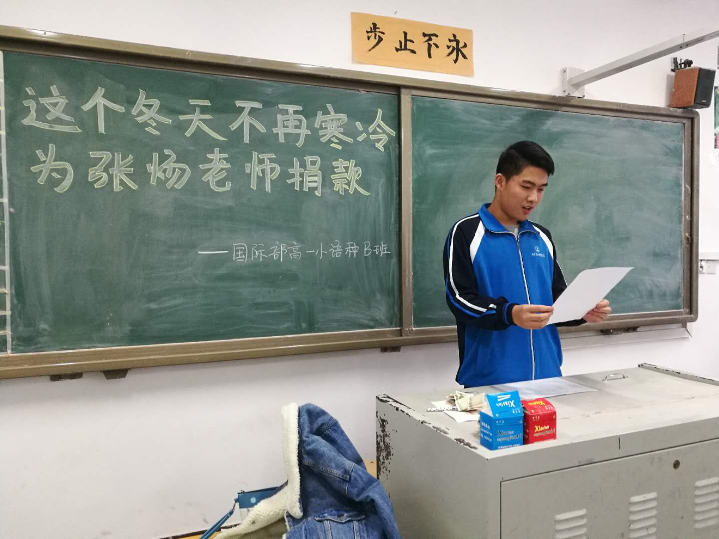 我校高中数学教师张炀病情传播开来,引起了广大学生、家长和教师群体的强烈反响。在学校工会和团委的号召下,国际部于12月19日,举行了为张炀老师捐款活动。活动结束,共募集学生捐款3167元,教师捐款1500元。