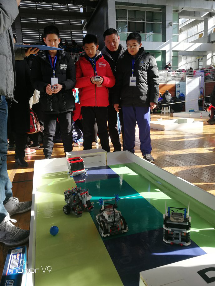 在WRO世界奥林匹克机器人竞赛项目中,我校初中学生马丁、刘熠凡、马显之等3名学生组成的河南师大附中5队分工合作,面对高中强敌,沉着冷静、临危不惧;上半场打平、下半场打平、加时赛再打平,表现出我校中学生的风采,最终获得初中组冠军。