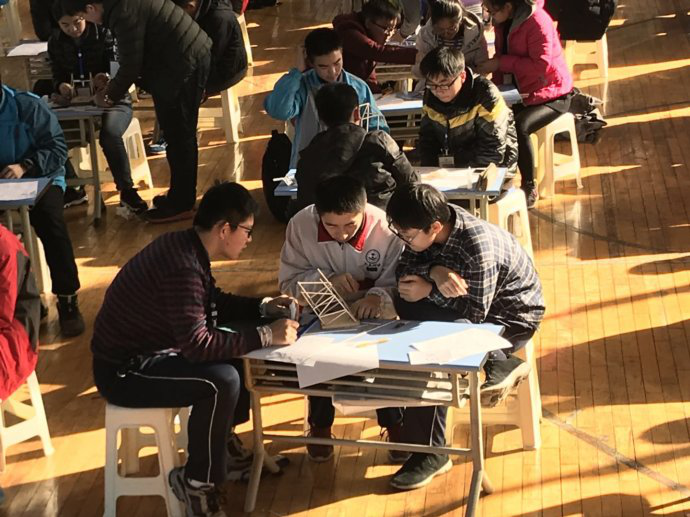 高一学生李智健、杨李乾坤、张翰鼎等3名学生组成的河南师大附中2队分工合作,有条不紊地正在设计制作中;