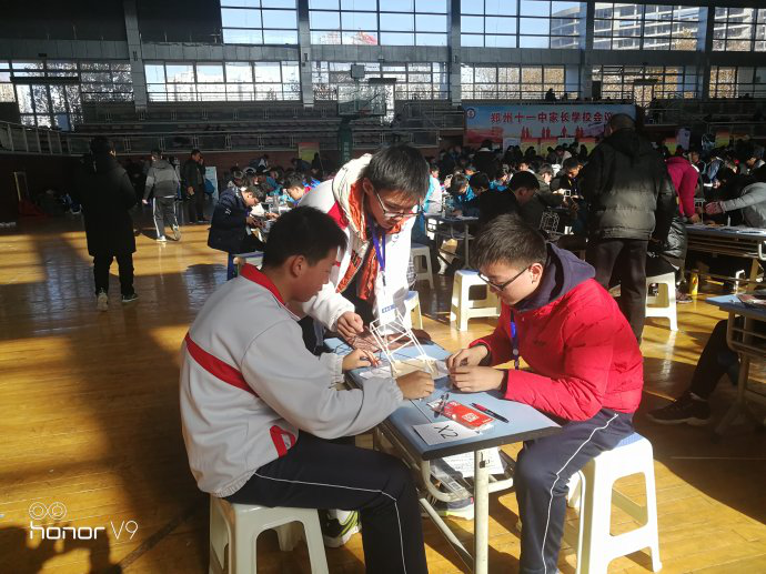 在现场制作项目中,我校高一学生王川、魏锦林、孙小茜等3名学生组成的河南师大附中1队分工合作,有条不紊地正在设计制作中;