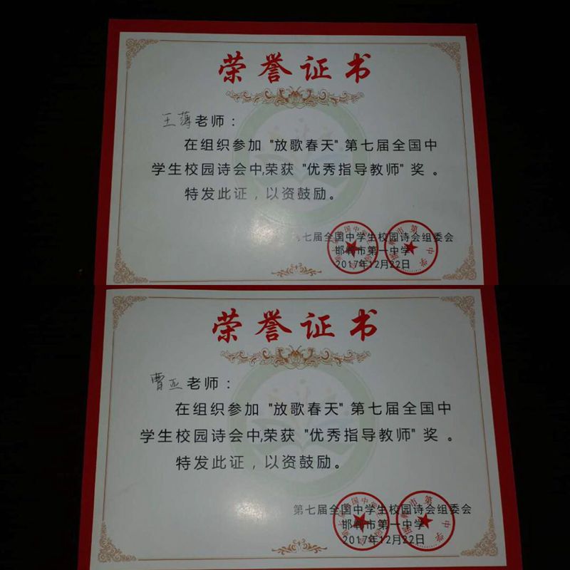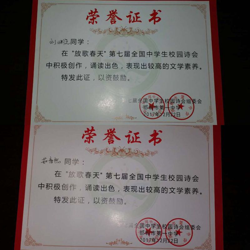 俊才星驰聚邯郸,吟咏春天歌华章。2017年12月21日-23日,我校师生一行4人参加了在河北省邯郸市第一中学举办的“放歌春天”第七届全国中学生校园诗会。