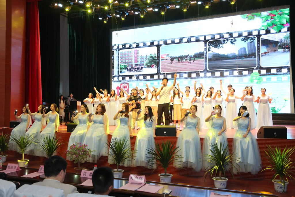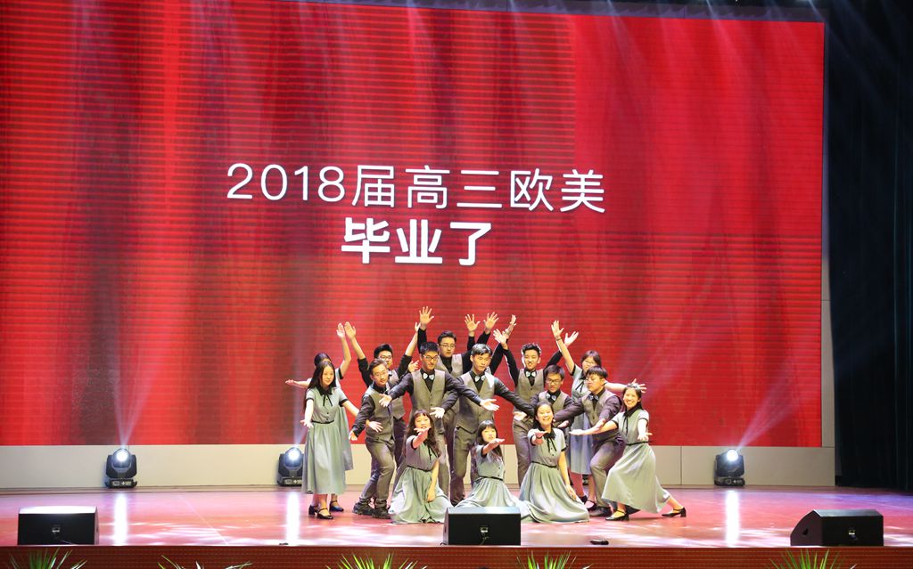 随后,毕业生家长代表、高三欧美班高子桐同学的母亲登台发言,温柔动听的讲述使得在场听众共鸣阵阵,而发言结束之时,女儿登台献上花束并与母亲深情相拥,更使得听众席上掌声连连。 再次响彻礼堂的掌声,为作为学生代表发言的中韩班学子张宝方同学而起,将要背起行囊走向远方的学长,在远行前分享了对短暂岁月的细腻品味与给学弟学妹的点滴经验,吐露心声,流露真情。 动情的言语感染了整座礼堂,而一组表演驱散了心头的感伤。家长们为心头骨肉卸下肩头事务,身着礼服,开启歌喉,齐声送上一曲《明天会更好》寄望未来;学弟学妹们并起稚嫩肩膀,手拉着手,为学长们献上一首《等你下课》期待重逢;而最后一届身穿卡其裤和蓝毛衫驰骋在西校区操场的2018届学子,则高歌一曲《青春不散,不说再见》,挥洒他们的青春不老,散发他们的青春正好,向陪伴他们走过青春的家长、老师、同学告白心迹,展现心怀。 同窗情谊重,师生情意浓。作为就要收拾书包、离开母校的毕业生,心里有太多话要对师长亲友说,无奈心音难诉,幸而花语有声!最后,毕业班的老师们走上舞台,把不舍化作微笑洋溢在嘴角;毕业生们走上舞台,把留恋藏进花香氤氲在眼底……一时间,馨香遍布于每一角落,温暖绽放在所有脸庞,祝福声此起彼伏,闪光灯你争我抢,唯恐漏掉一个瞬间,唯恐落下一位同窗,昔日齐聚首的礼堂,今天汇集百感细流,翻滚起别离的波涛,变成了快乐的海洋……