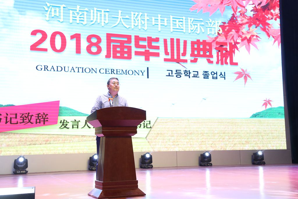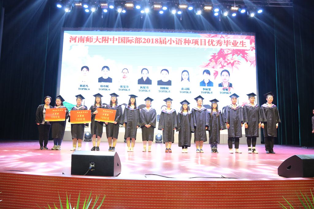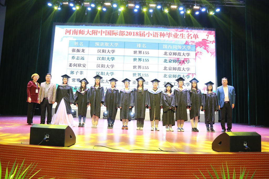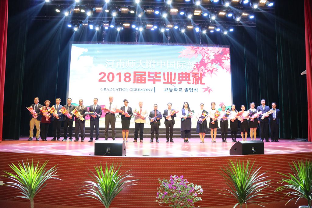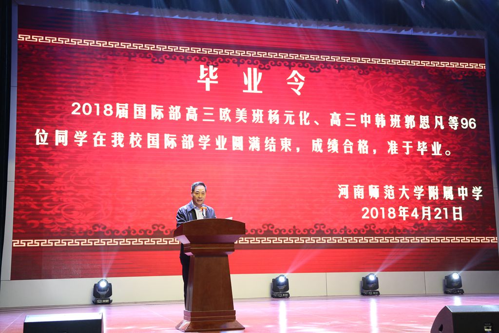 青春不散今日别,只为良辰再相见!4月21日下午,我校国际部2018届毕业典礼在西校区大礼堂隆重举行。校党委书记包卫忠、副校长刘齐晋、王继民、赵振华、杨相臣等学校领导和国际部中外教师、学生、家长一道,共同见证了国际部又一年的丰收、又一届的辉煌。 15时30分,在流淌着淡淡离别意味的开场VCR和充满国际部师生涉狂澜而若通衢豪迈气势的古筝合奏《战台风》开场表演结束后,主持人苏雅文老师、李雷老师、高子桐同学、姜何欣安同学、袁知雨同学和孙宝发同学闪亮登场,在中英日韩四种语言的国际部学部号深情呼唤声中,典礼正式拉开帷幕,嘹亮的国歌奏起,全体观众凝神肃立,共同注视鲜艳的五星红旗徐徐升起,耀眼的中国红映射在嘉宾面庞,铿锵的旋律激荡在典礼殿堂。 升旗礼毕,包卫忠书记阔步走上舞台,代表学校领导向国际部全体师生、家长和各界嘉宾表示祝贺和感谢,浓情寄望毕业学子永攀高峰,深情期待在读学子再立新功,温情话语亲切真挚,听众心中春潮涌动。 之后,王继民副校长宣读了《河南师大附中国际部毕业令》,庄重宣布2018届全体毕业生圆满完成学业,正式毕业。钟吕之声响处,列队齐候的毕业学子激动鼓掌,为即将开启的人生新篇蓄力加油。 十年寒窗,求学路漫长修远;一颗初心,学子意坚定执著。今天,一位位国际部毕业生身披学士服,头戴学士帽,意气风发地走上舞台,静待恩师拨穗。在家长和学生期待的目光中,包卫忠书记和刘齐晋、王继民、赵振华、杨相臣副校长、王晓玲主任先后来到毕业生面前,为孩子们一一拨穗施礼,送上祝福,孩子们一一鞠躬受教,表达感念。 沉甸甸的学士帽穗,积聚着家长、亲友的希望,沉淀着学校、老师的重托,见证了学子的努力。入校以来,国际部学子披荆斩棘,在老师与同学的帮助下,知识与能力、道德与品质全面提升,涌现出了多位品学兼优的先进典型。为表彰先进,国际部特意邀请中育贝拉教育集团总裁李松先生、天英国际教育集团总裁张素文女士作为颁奖嘉宾,送上了温暖的鼓励和祝福!