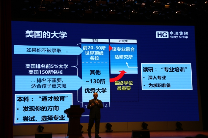 Hendryx先生对比了中美两国的教育特点,他认为美国的教育更注重学生的自身成长,更注重企业需求,围绕学生的未来发展培养各种能力,这点在大学的录取标准上体现的尤为突出。Hendryx先生通过数据分析,总结麻省理工、耶鲁、哈佛、斯坦福等世界顶尖大学的录取标准,并结合自己作为面试官的亲身经历,给与会家长和同学提供许多富有实效的宝贵经验,对如何选择更适合自己的美国大学给出了“美国教育专家”独到的见解,让与会家长和同学受益匪浅。