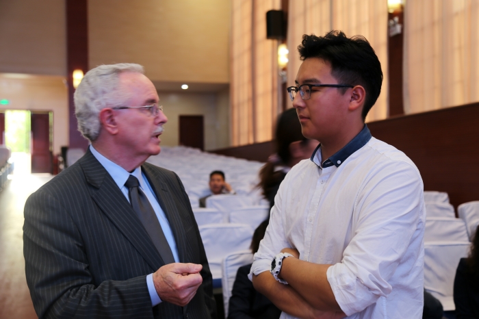 Hendryx先生从留学的价值、美国教育体系、美国大学申请三个方面详细的分享了自己对美国教育的深入理解。Hendryx先生认为中国经济的快速发展离不开中国的改革开放和国际交流,更离不开国际教育领域的快速发展,大批的留学人员提升了中国的国际理解,在促进中西方交往、提高中国的科技水平方面发挥了巨大的贡献。面对日益频繁的国际竞争和国际合作,只有接受国际教育才能最快程度地提升自身的竞争力,中国的家长和学生要有更长远的眼光和更宽阔的视野。Hendryx先生对我校国际部给予高度评价,他认为在新乡这个中部城市,河南师大附中作为一个公办学校在2010年就能认识到国际化教育的重要性,成立国际部,并且能培养出多位世界前十顶尖大学的毕业生是很了不起的事。
