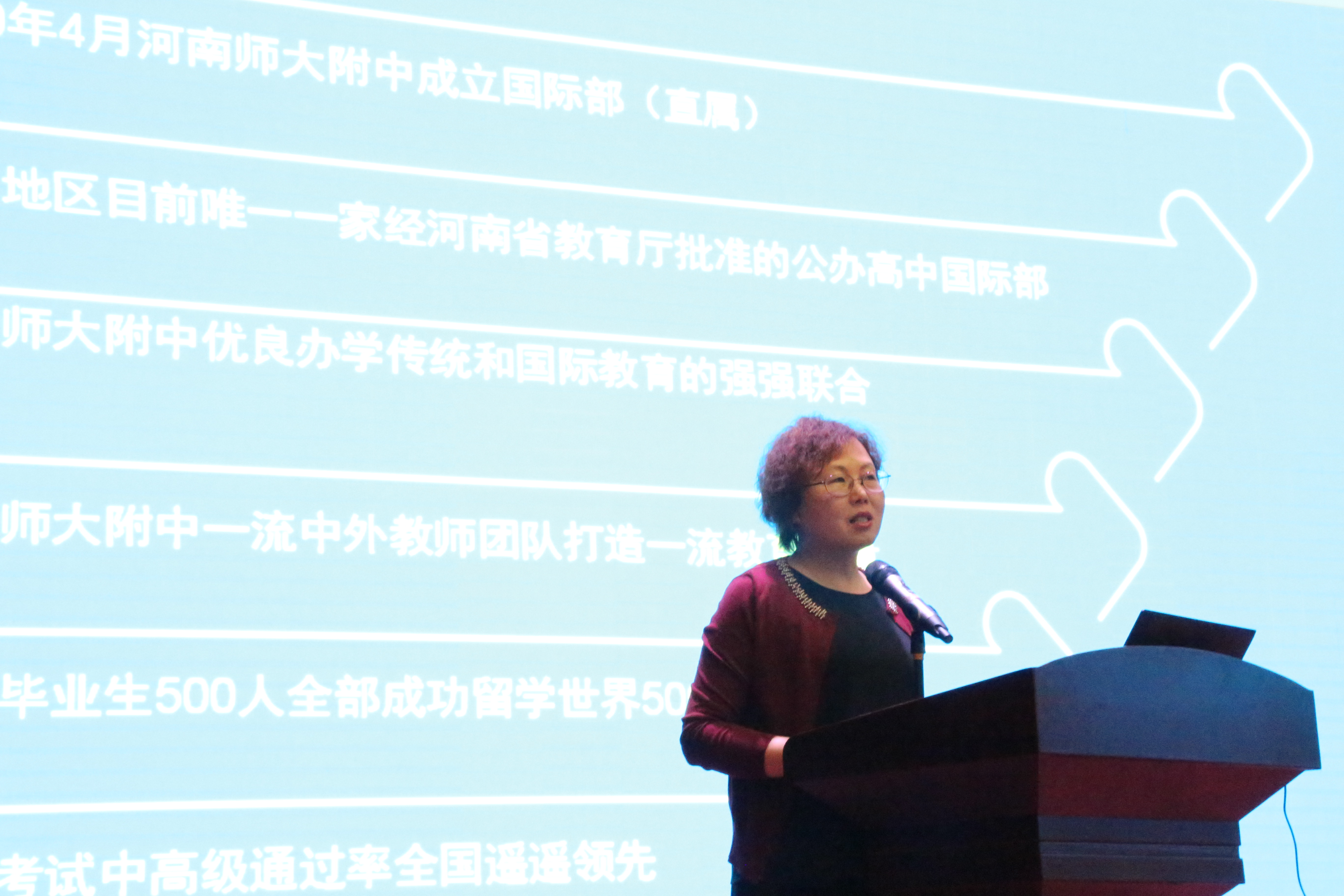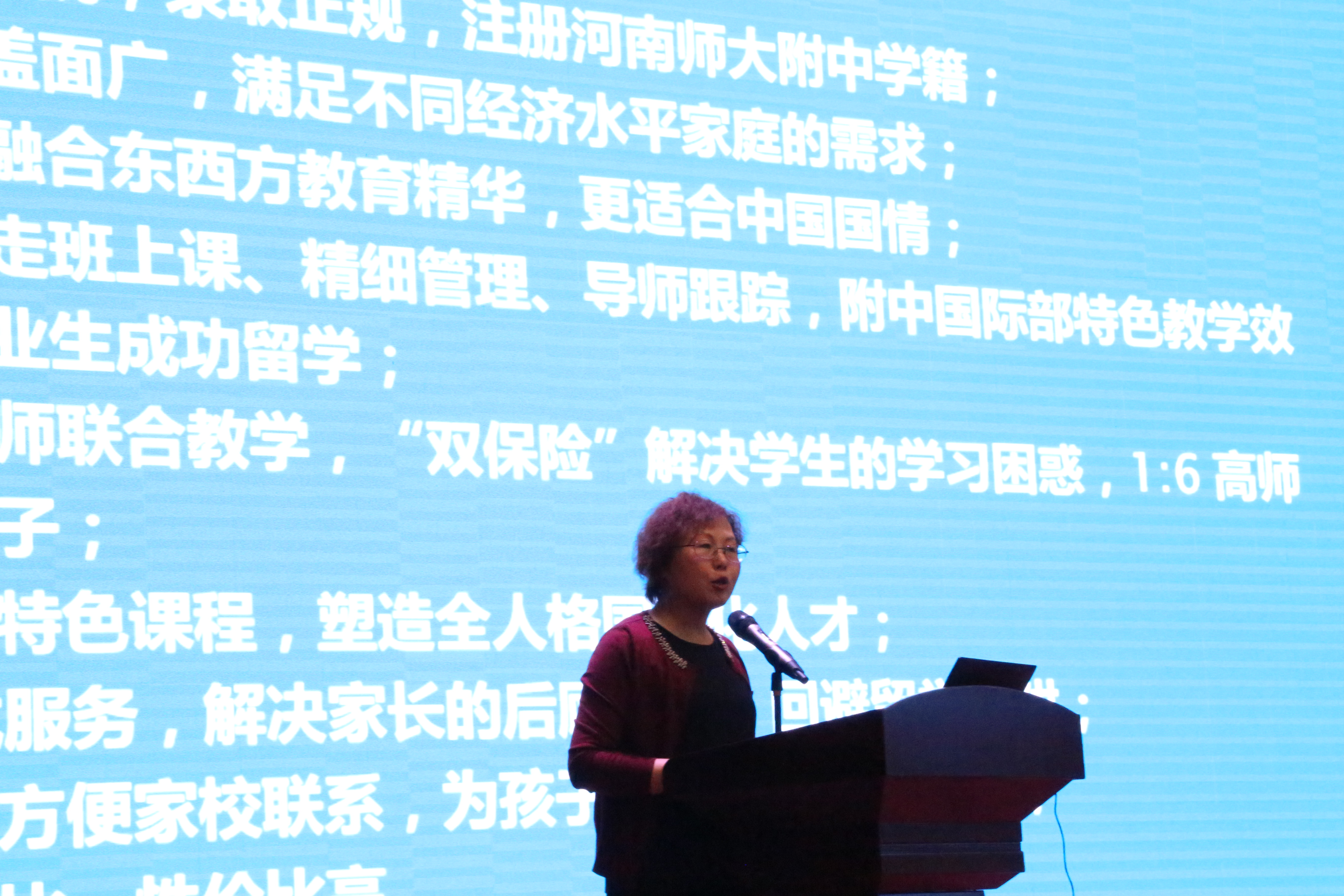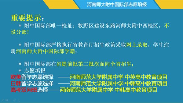 为给高考重压之下的家长指明道路,为助力中考考生家长填报志愿,河南师大附中国际部主任王晓玲、副主任吴向辉在今天召开的河南师大附中中招志愿填报说明会上向到会家长阐明了国际教育理念之新、海外名校资源之优,用具体数字彰显了附中国际部办学成绩之高、育人质量之强,事实有力雷贯耳,数字有声雨入心。