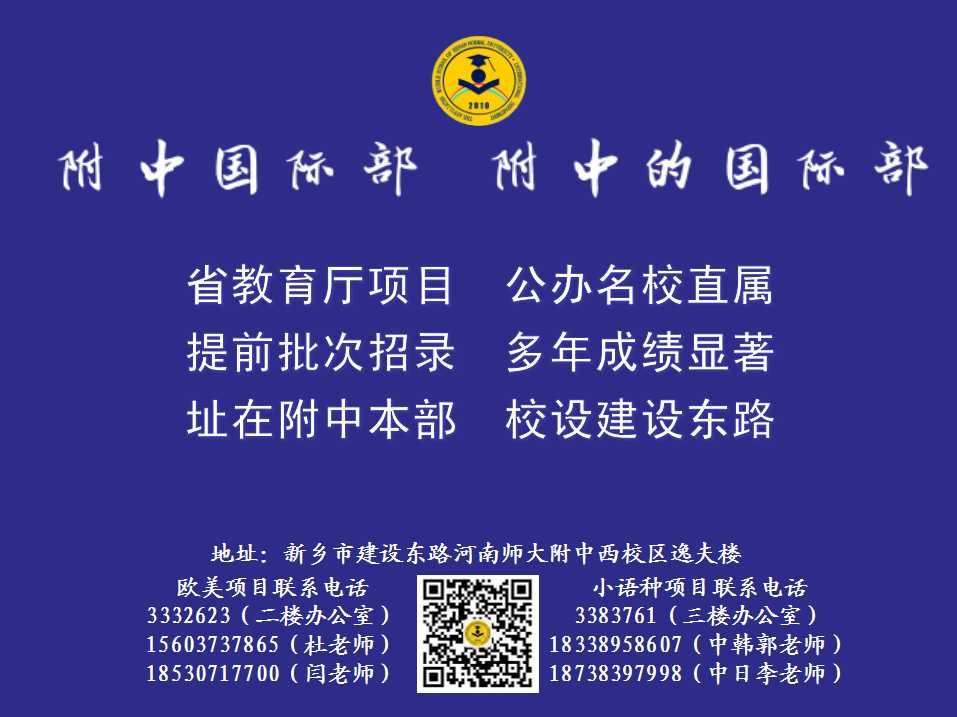 | 联系方式 | 联系电话 0373-3383761(办公室) 18338958607 郭老师 18738397998 李老师 地址 河师大附中西校区 逸夫楼三楼小语种项目办 | 联系电话 0373-3332623(办公室)15603737865 杜老师 18530717700 闫老师 地址 河师大附中西校区 逸夫楼二楼欧美项目办 |
