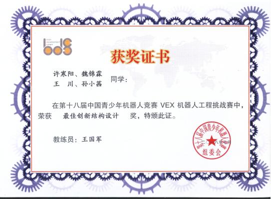 由于河南师大附中FZRC在本次比赛突出表现,王国军同志被评为第十八届中国青少年机器人竞赛优秀教练员,同时被聘为第十八届中国青少年机器人竞赛VEX项目裁判员。