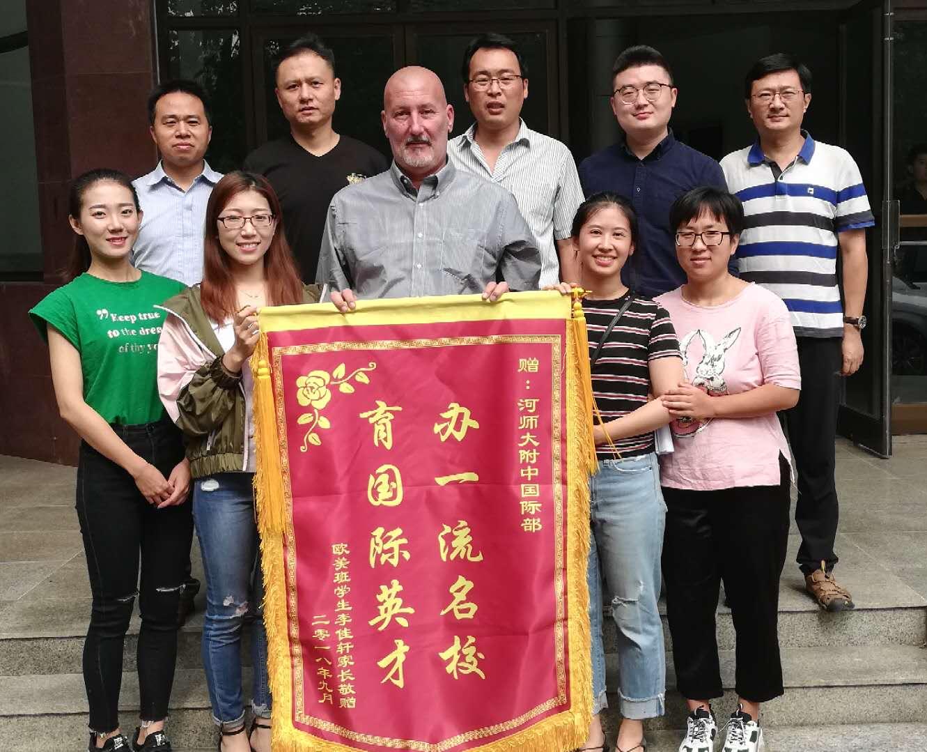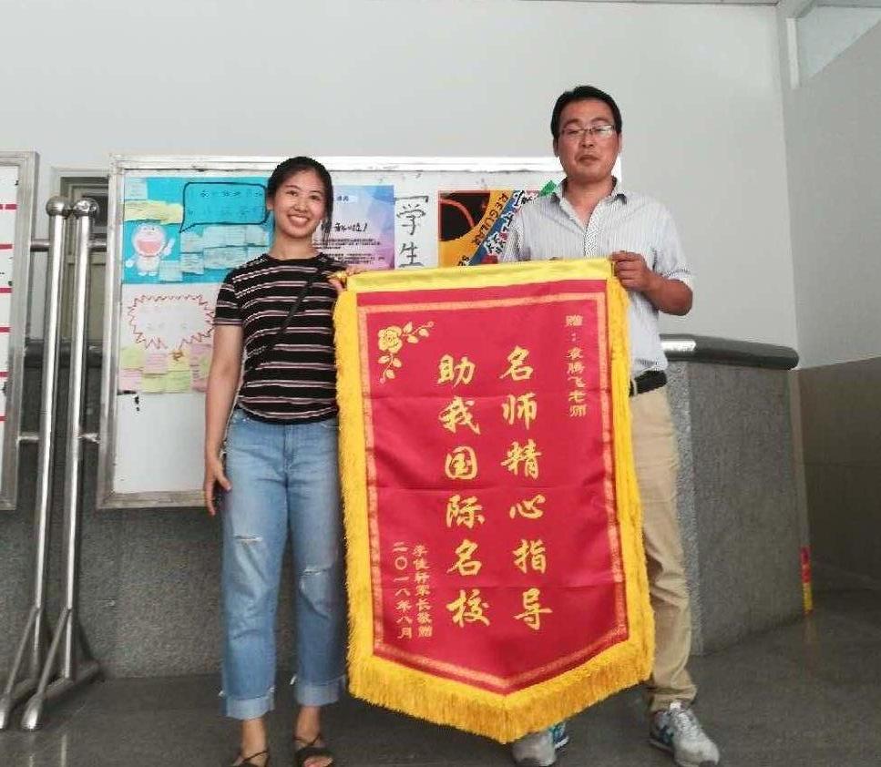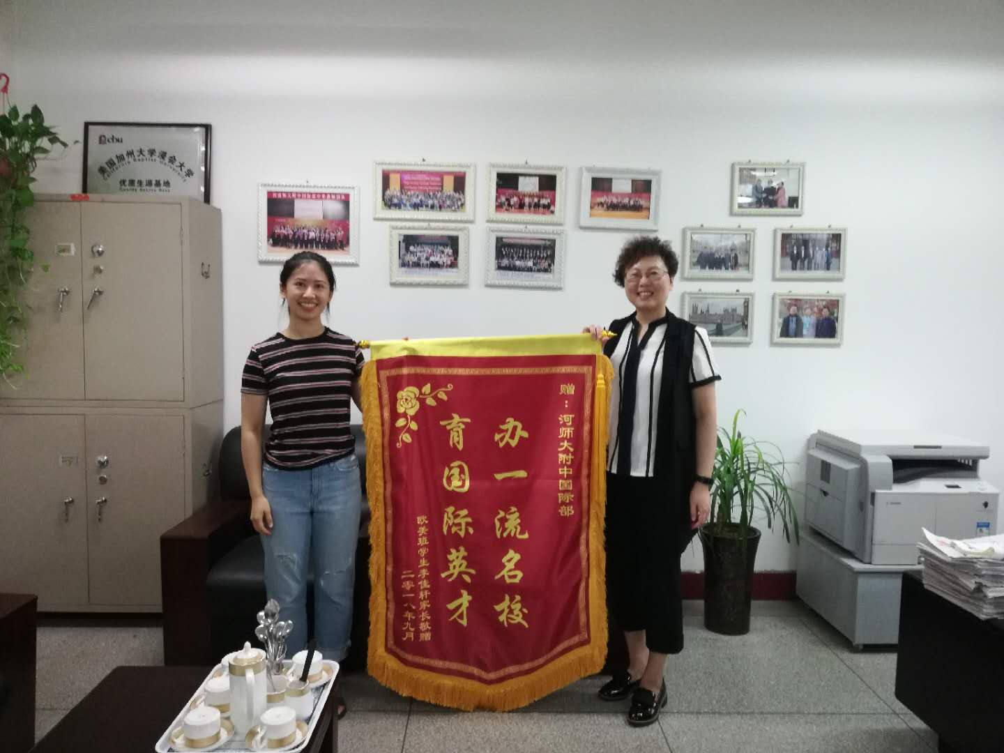 经师易得,人师难求。创建九年来,国际部始终秉持河南师大附中“人本立校·立德树人”的办学理念,把中外先进教育理念渗透在日常教育教学中,育人师,育英才,培养了一批又一批优秀学子远赴海外名校深造,李佳轩同学就是这样一位典型代表。在国际部欧美班刻苦学习三年后,她收到了美国五所著名高校的录取通知书,在整妥行装出国留学之前,教师节来临之际,她回到母校,向曾经日夜相伴的附中国际部和朝夕共处的老师老班敬献锦旗,深致谢意。