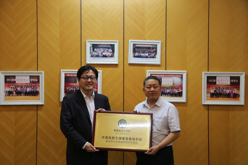 9月19日,韩国延世大学代表团对我校进行友好访问,授予我校“优质生源推荐基地学校”牌匾并作专场报告,河南师大附中校长刘黎、国际部主任王晓玲、副主任吴向辉热情接待了来访代表团。