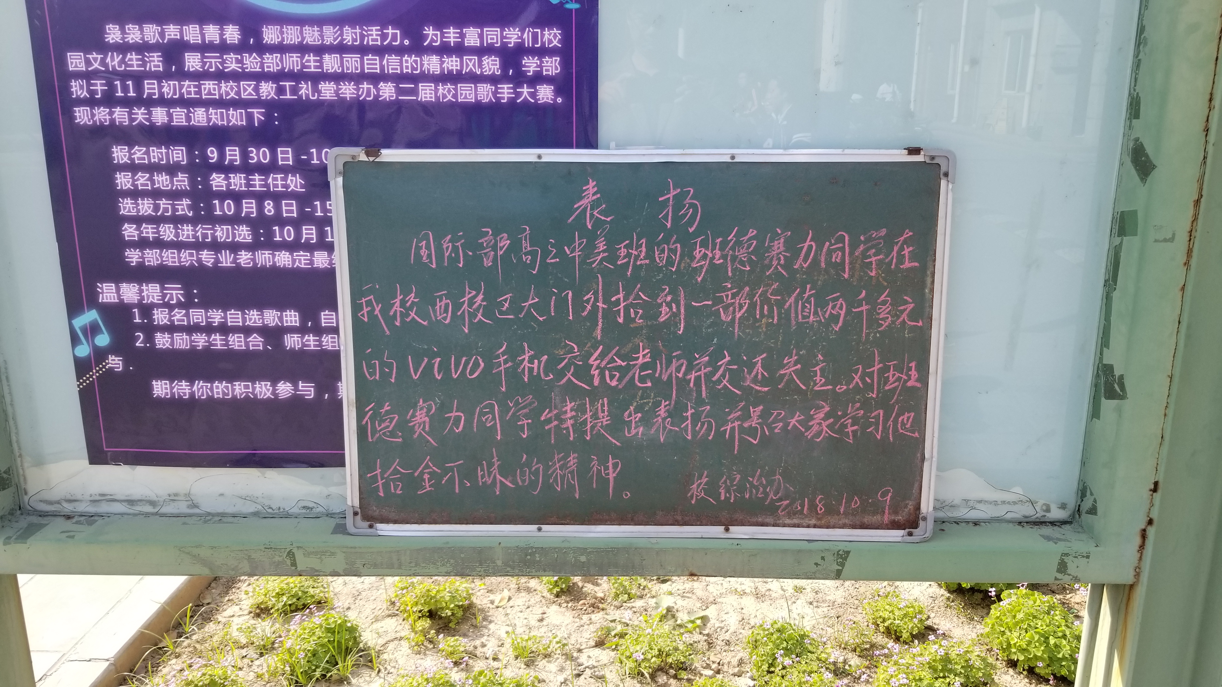 10月9日,师大附中综治办在附中校门内树立板牌,对国际部欧美项目2019届学生班德赛力同学在捡拾到价值不菲的名牌手机后自觉上交的行为提出表扬并号召学生学习其拾金不昧的精神。