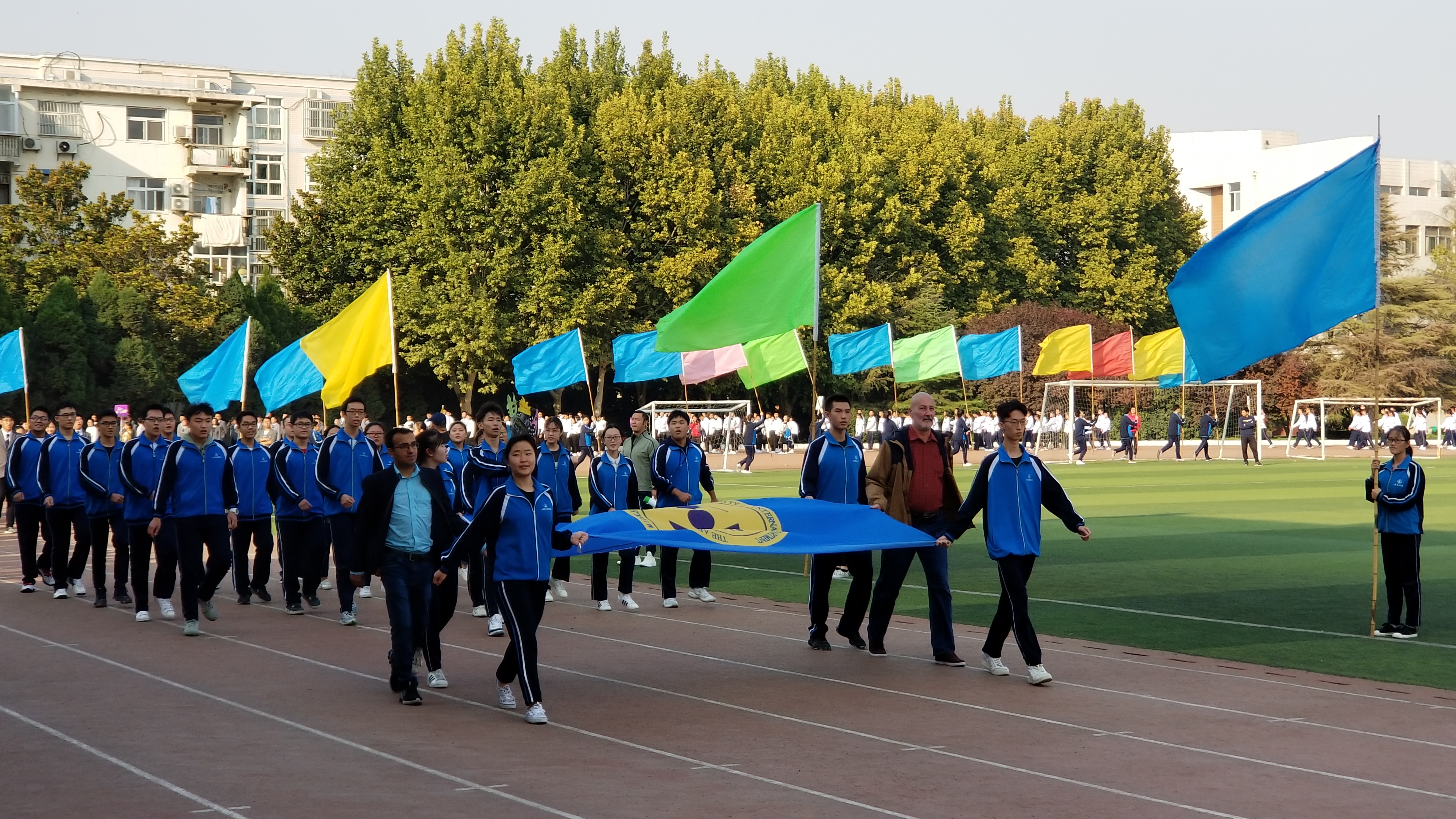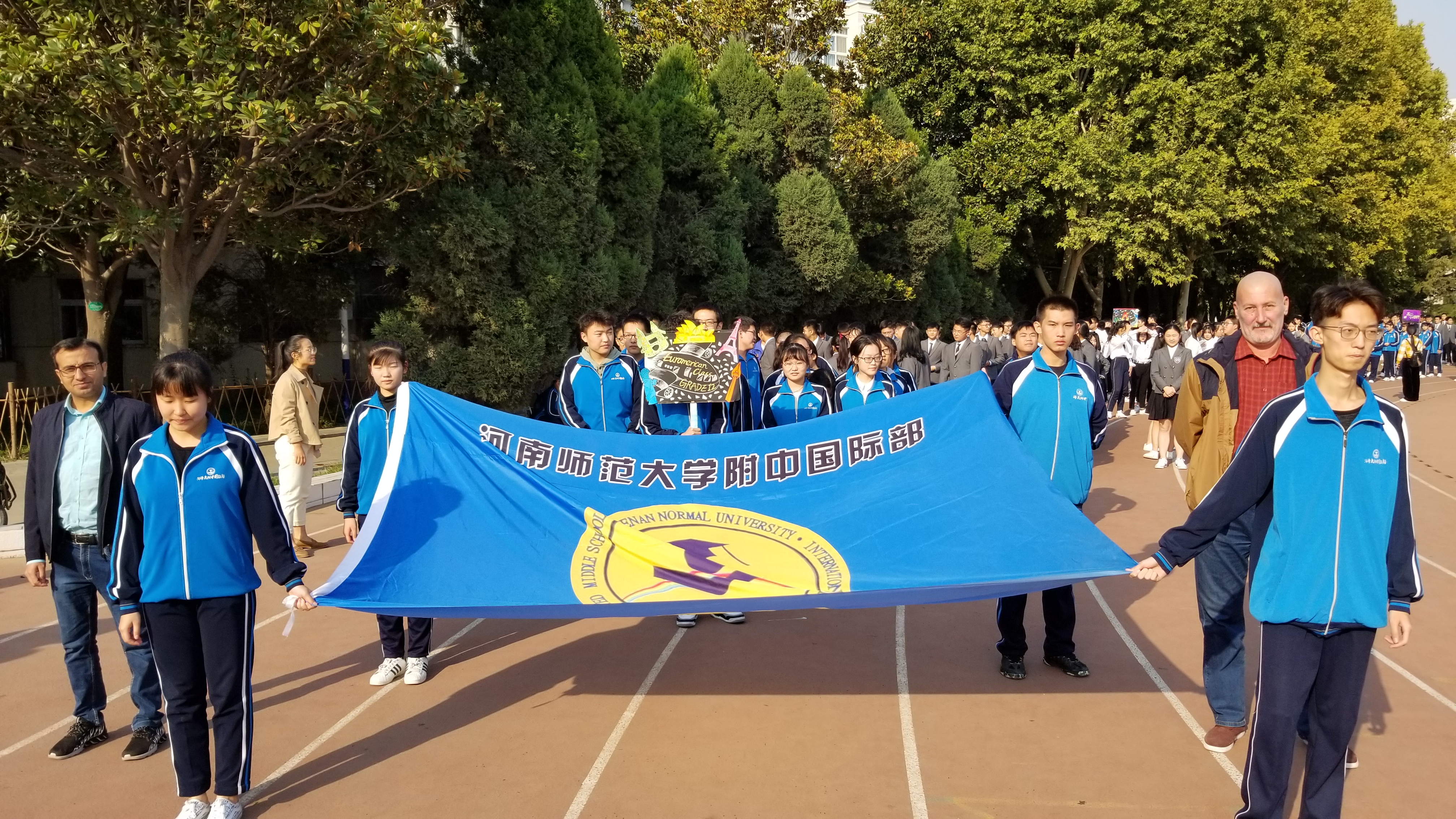 和往年一样,国际部各班队列排在学校乐队和裁判员代表队之后,在精彩的篮球、足球和啦啦操表演结束后,作为河南师大附中第一组学生队列,率先闪亮登场。当国际部外教代表Teodor老师、Jack老师和国际部同学一起守护国际部旗帜入场时,当国际部同学身着国际范正装校服意气风发地在跑道亮相时,绿茵场上响起了青春少年的热烈欢呼,在主席台就坐的学校领导、国际部主任王晓玲和副主任吴向辉也频频挥手向孩子们致意。