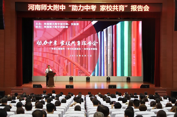 由河南师大附中初中部、实验部和国际部联合举办的2019年中考备考报告会在附中西校区礼堂举行,报告会由初中部副主任周晋阳主持,资深教育专家、优秀级班主任、心理辅导师先后登台讲解,针对考前家校配合、心理辅导、人生规划为家长排忧解难!家长朋友纷纷舍弃周末休息时间,在儿童节,为了孩子,回到小时候,来到大礼堂,共上一节课!