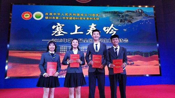 第九届全国中学生校园诗会已经圆满结束。此行银川,我们得到了学校领导的高度重视和支持,得到了语文教研组长周枫琳、张军老师和各位同仁的鼎力支持,得到了参赛学生家长们理解和支持。衷心希望,尚未被列入中考、高考项目的现代诗歌,能够在不远的将来成为校园新生的文化思潮,成为学生们行吟校园的意识流。希望学生们能够爱上校园诗歌的吟诵,爱上校园诗歌的意境, 爱上校园诗歌的创作。愿诗歌以春天的姿态阔步走进校园,愿校园因为诗歌的滋养而更显青春。