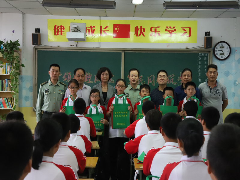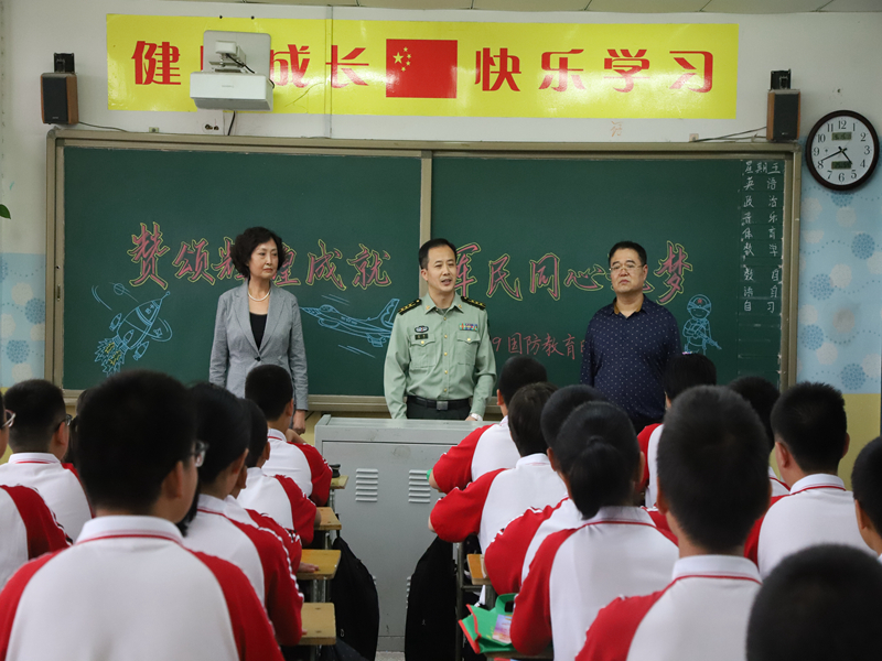 活动现场,陈伟一行和同学们一起观看国防教育宣传展板,向大家讲解国防知识,发放宣传品,亲切勉励青年学生积极增强国防观念,履行国防义务。随后,在初中部1917班,开展“国防教育进班级”活动,孩子们用印着“中国梦强军梦我的梦”字样的文化尺画起了飞机军舰。班主任高晓亮老师欣慰地说,文化尺、方便袋等宣传品方便实用,切实让国防知识握到手心,让国防意识走进心头,孩子们用一次尺子,就受一次教育。