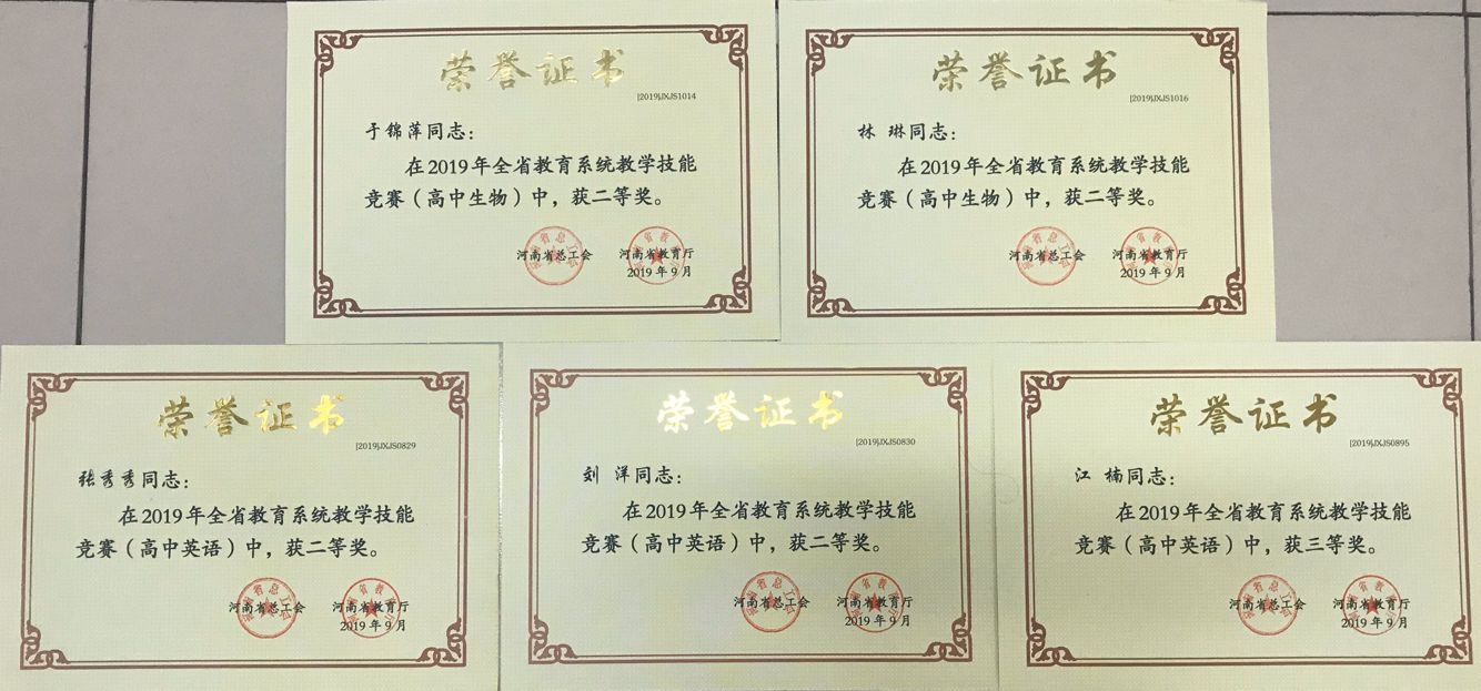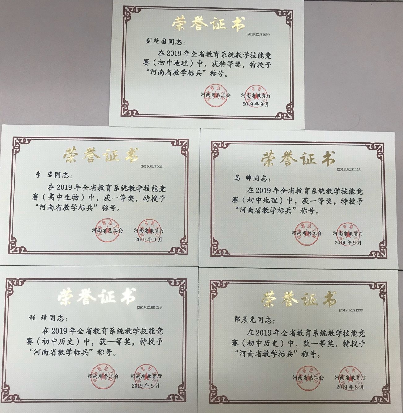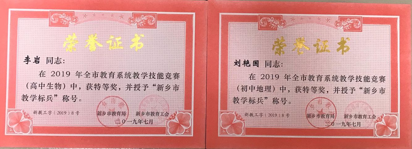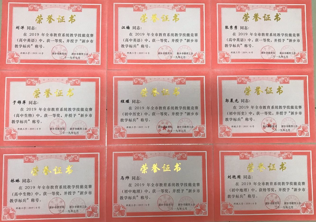按照新乡市教育局和新乡市总工会联合组织举办的2019年教育系统教学技能竞赛成绩排名,我校刘艳国等十位教师均被推荐参加由河南省教育厅及河南省总工会组织举办的河南省教学技能竞赛,经过专家评审团评选出各科前六名后,又进行了现场讲课评比。最终,在省级竞赛中,刘艳国老师获省级特等奖,程瑾、郭晨光、马帅、李岩四位教师获省一等奖,以上教师均被授予“河南省教学标兵”荣誉称号,于锦萍、林琳、张秀秀、刘洋四位教师获省二等奖。