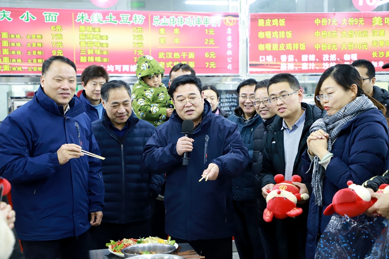 本次元旦联欢的特色创新活动是厨艺比拼,按要求各个分工会准备不低于10道菜肴,大家欢聚一堂共同品尝,有节日的欢乐,有家庭的温暖。在展出的各种菜肴中,炖制鸡块嫩而不柴,咸中带甜,咸甜恰好遮盖了油腻感,技艺高超;“钵钵鸡串串香”做法新颖广受年轻教师的欢迎,充分体现了一个“吃货”的本领;高中工会的“土豪”老师还烧制了一份红烧肉,荣登今晚“最贵”的菜肴......各分工会还制作有寿司、沙拉、甜点等,有“汉式”“和式”“西式”,风格多种多样,体现了老师们的多才多艺。校领导在慰问时,除了兴趣盎然的品尝了各色美味佳肴外,为每个制作菜肴的“大师傅”送出了吉祥物“金钱鼠”。