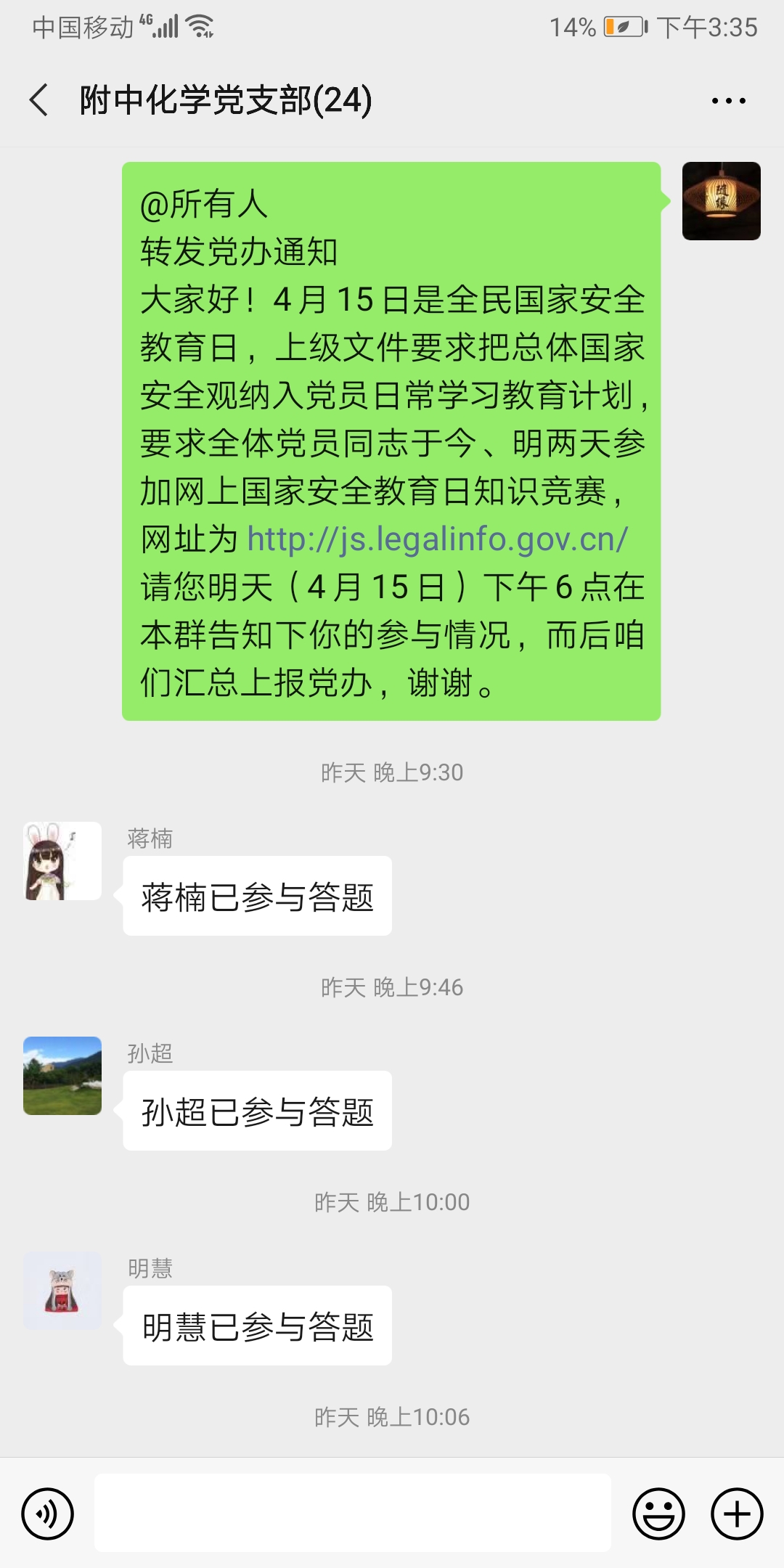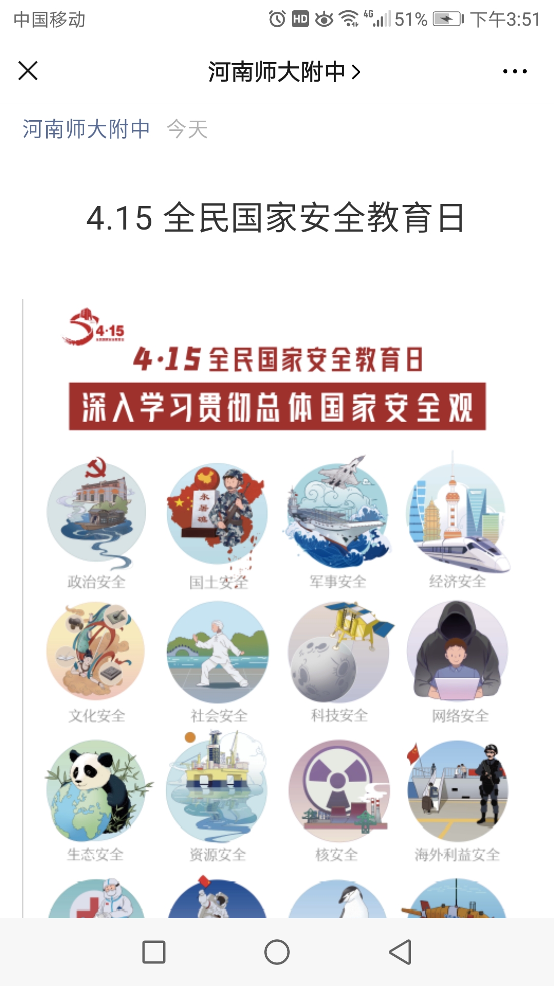 三是以“坚持总体国家安全观,统筹传统安全和非传统安全,为决胜全面建成小康社会提供坚强保障”为主题,在全校范围组织开展学生专题班会。对于未开学的年级,依托网络教学模式,组织网上专题班会学习,引导学生牢固树立国家安全意识。